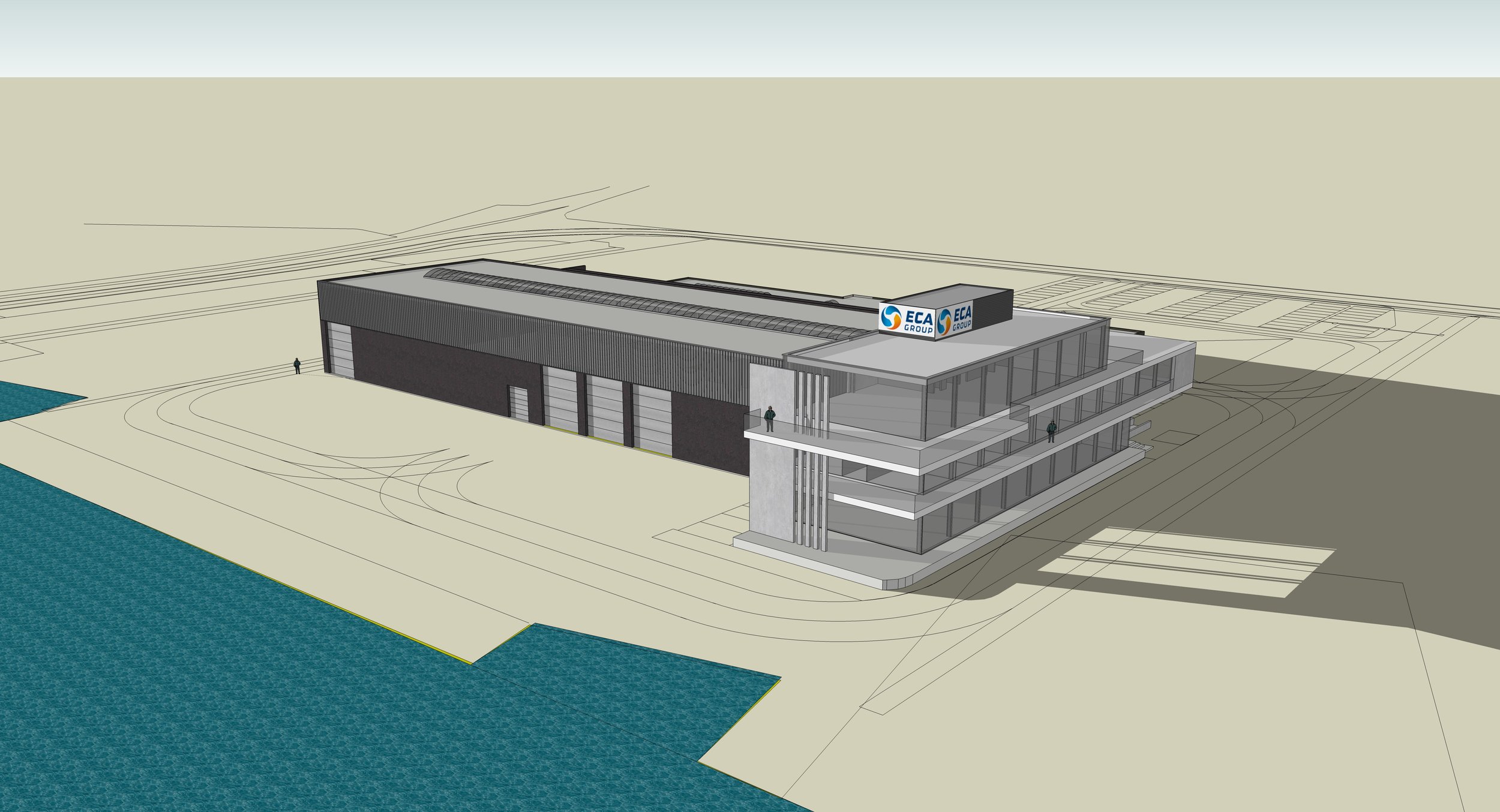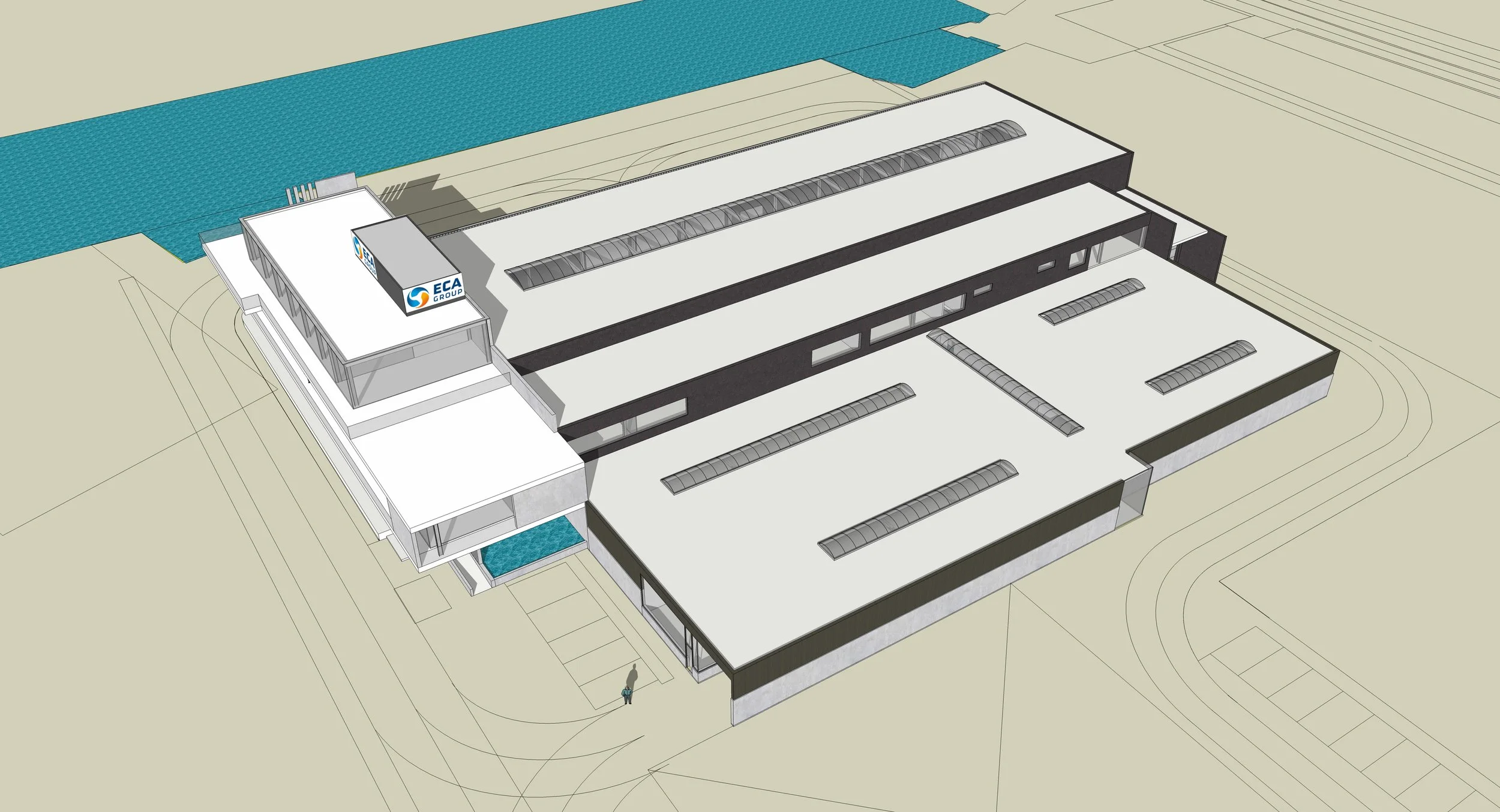 “ ECA Robotics” te Oostende . Projectstudie voor een nieuwbouw met ateliers en kantoren voor de constructie van onderwater drones. Vormgeving en materiaalgebruik werden bepaald door het karakter en de functie van het gebouw. Industrieel, duurzaam, sober en esthetisch.
