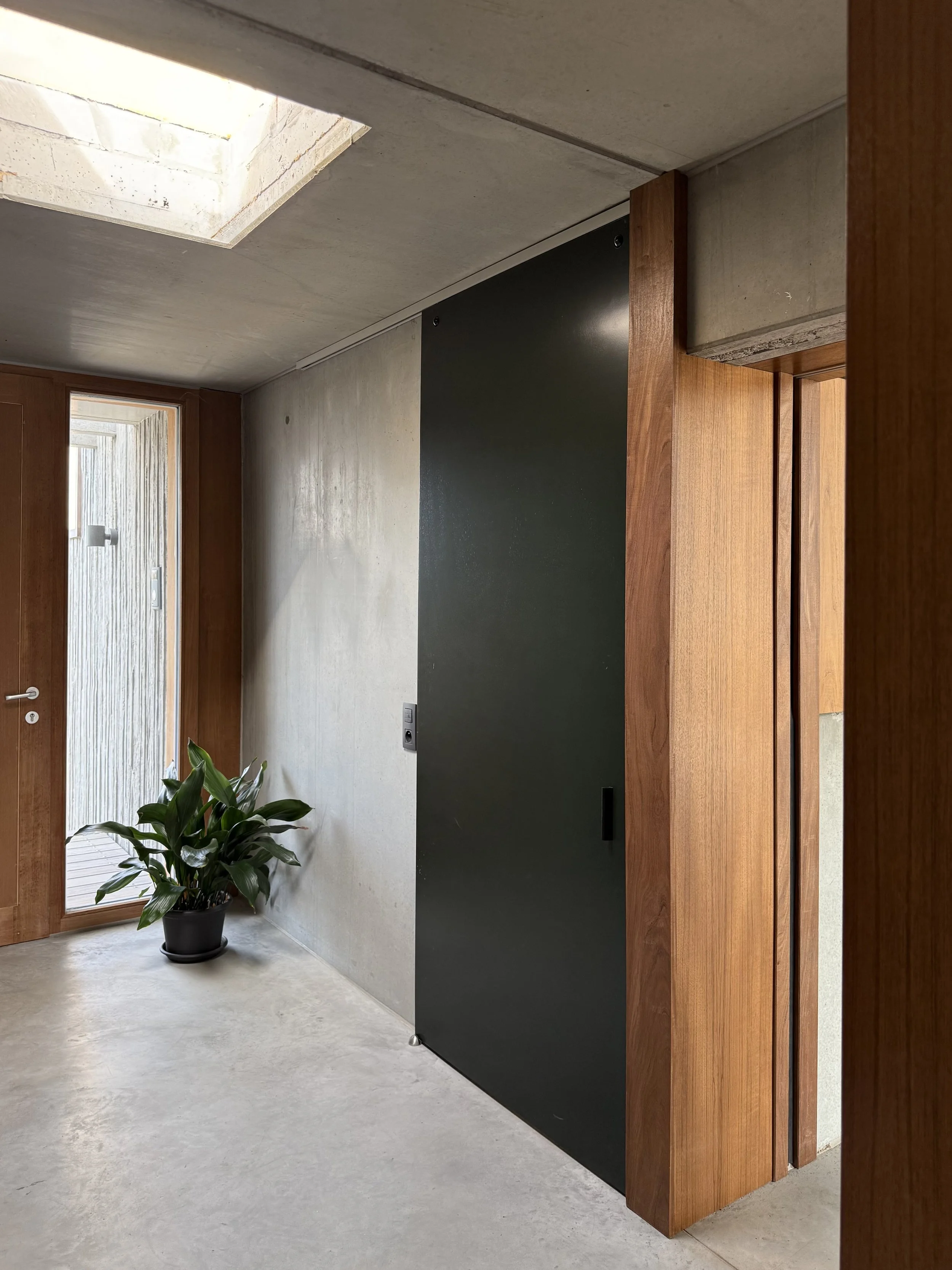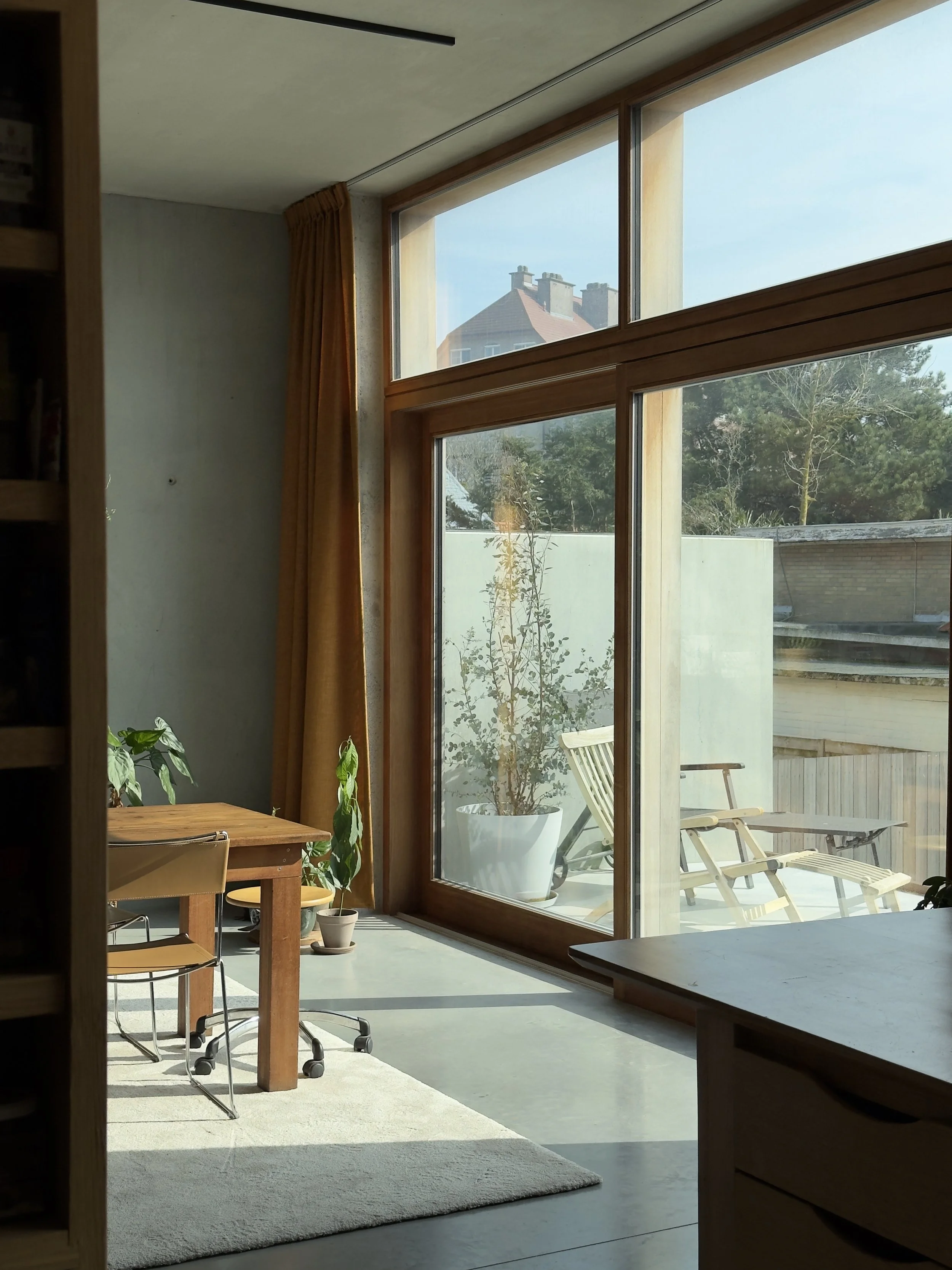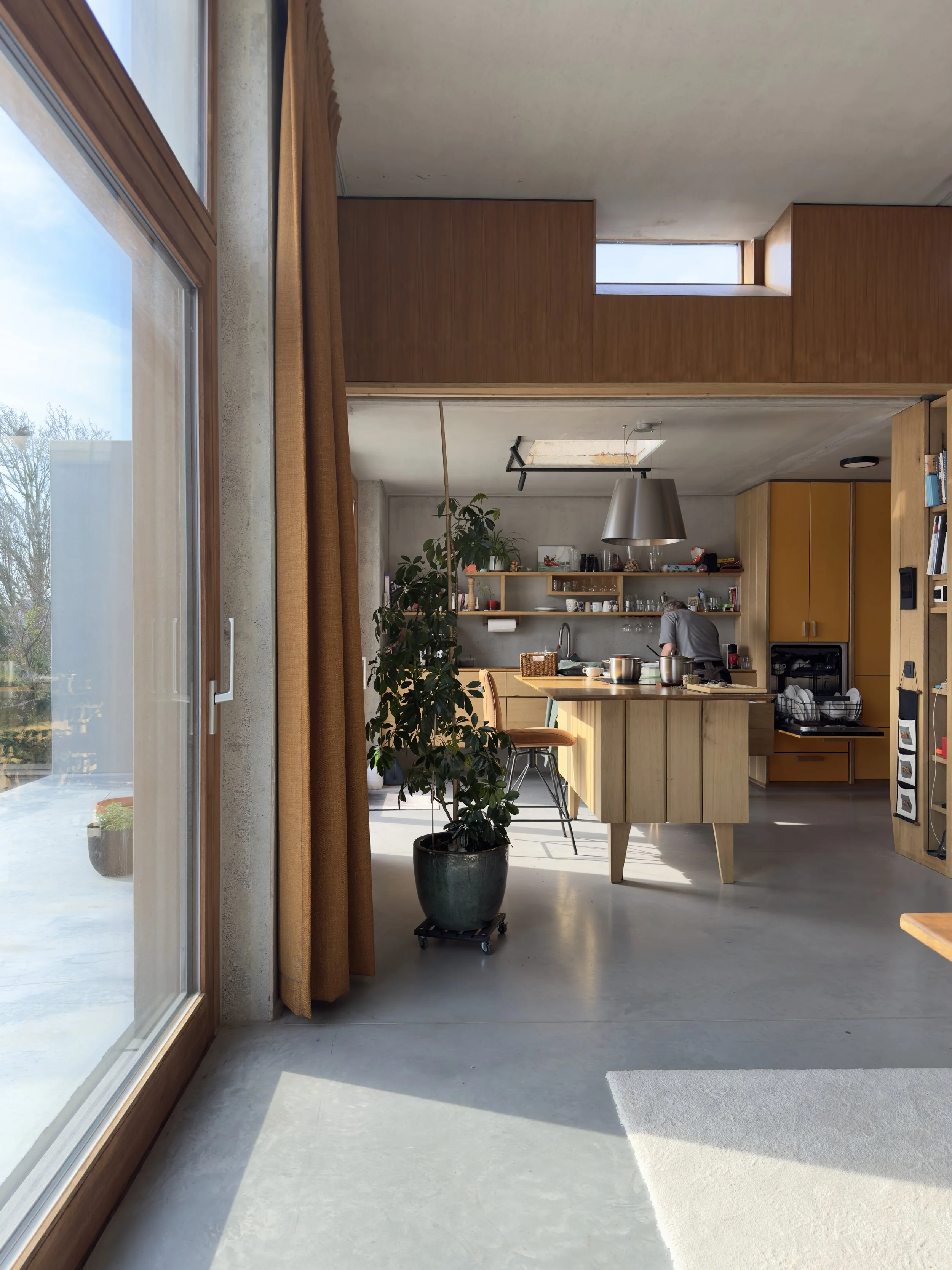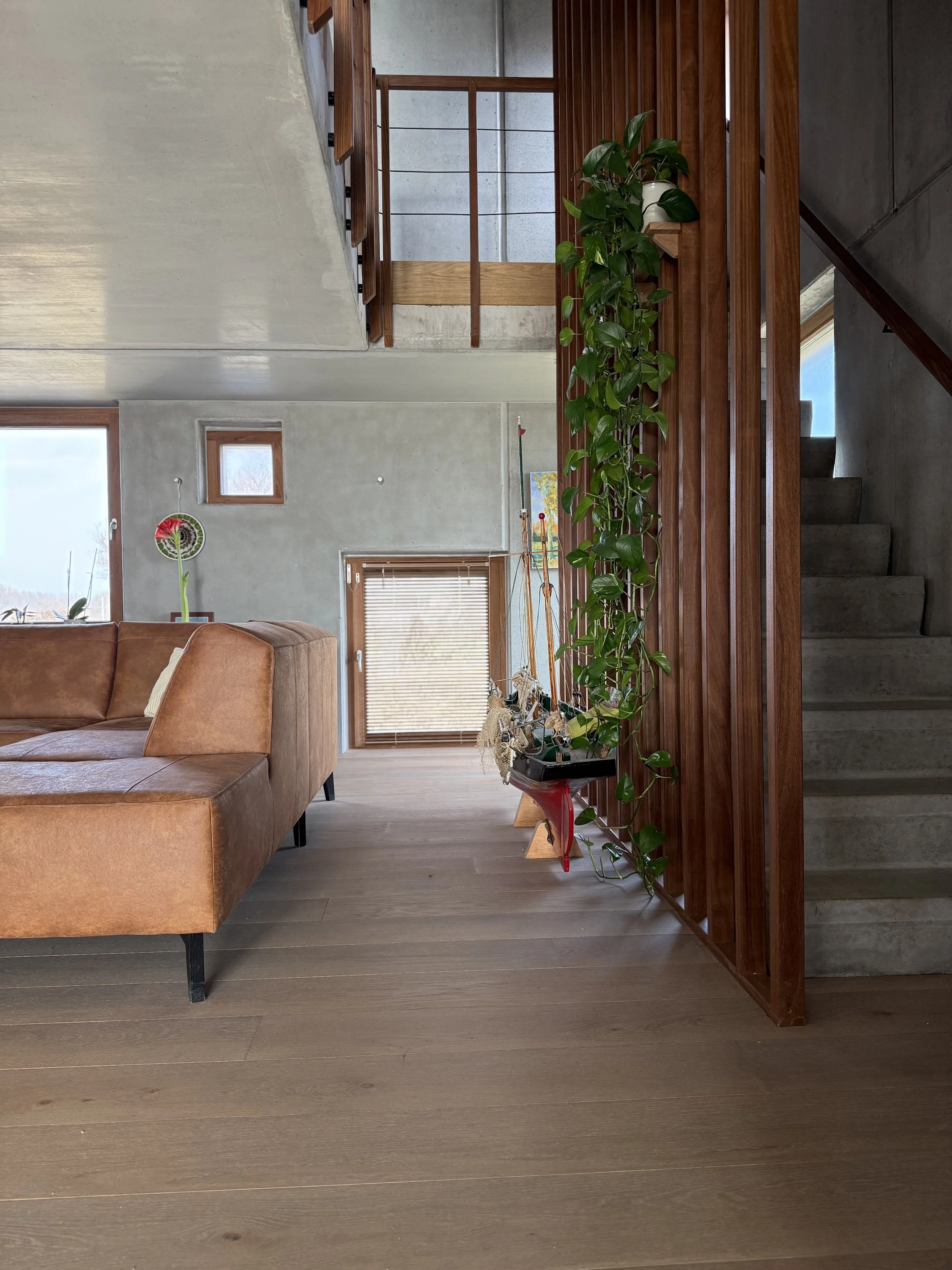 In het interieur van deze nieuwbouwwoning wordt gebruik gemaakt van eenvoudige natuurlijke materialen. Het contrast tussen enerzijds het ruwe industriële karakter van het beton en anderzijds de natuurlijke zachtheid van het hout, zorgen voor een harmonieus samenspel, een warme sfeer met een maritiem karakter.
