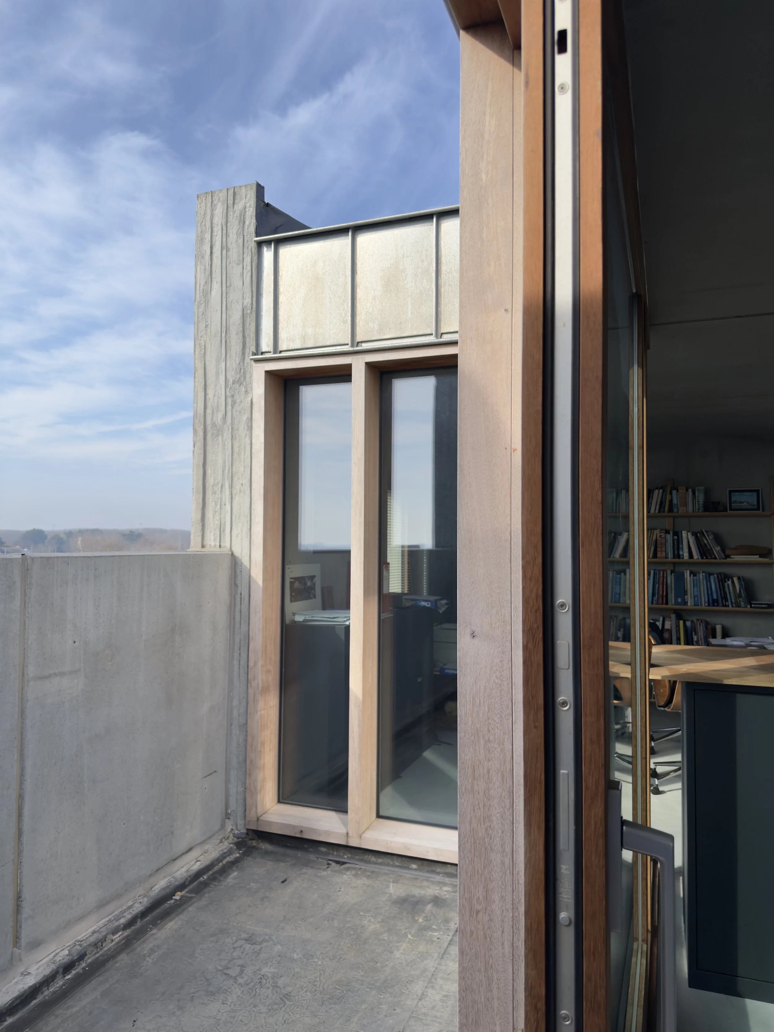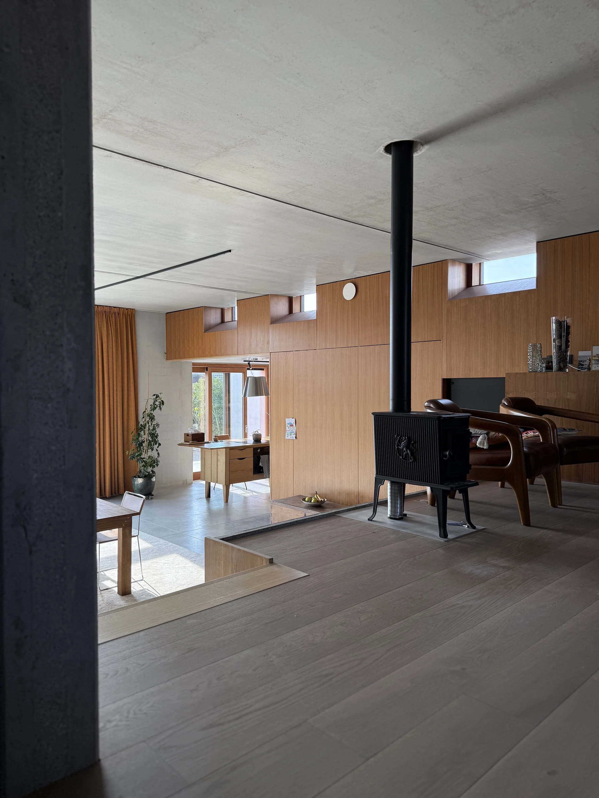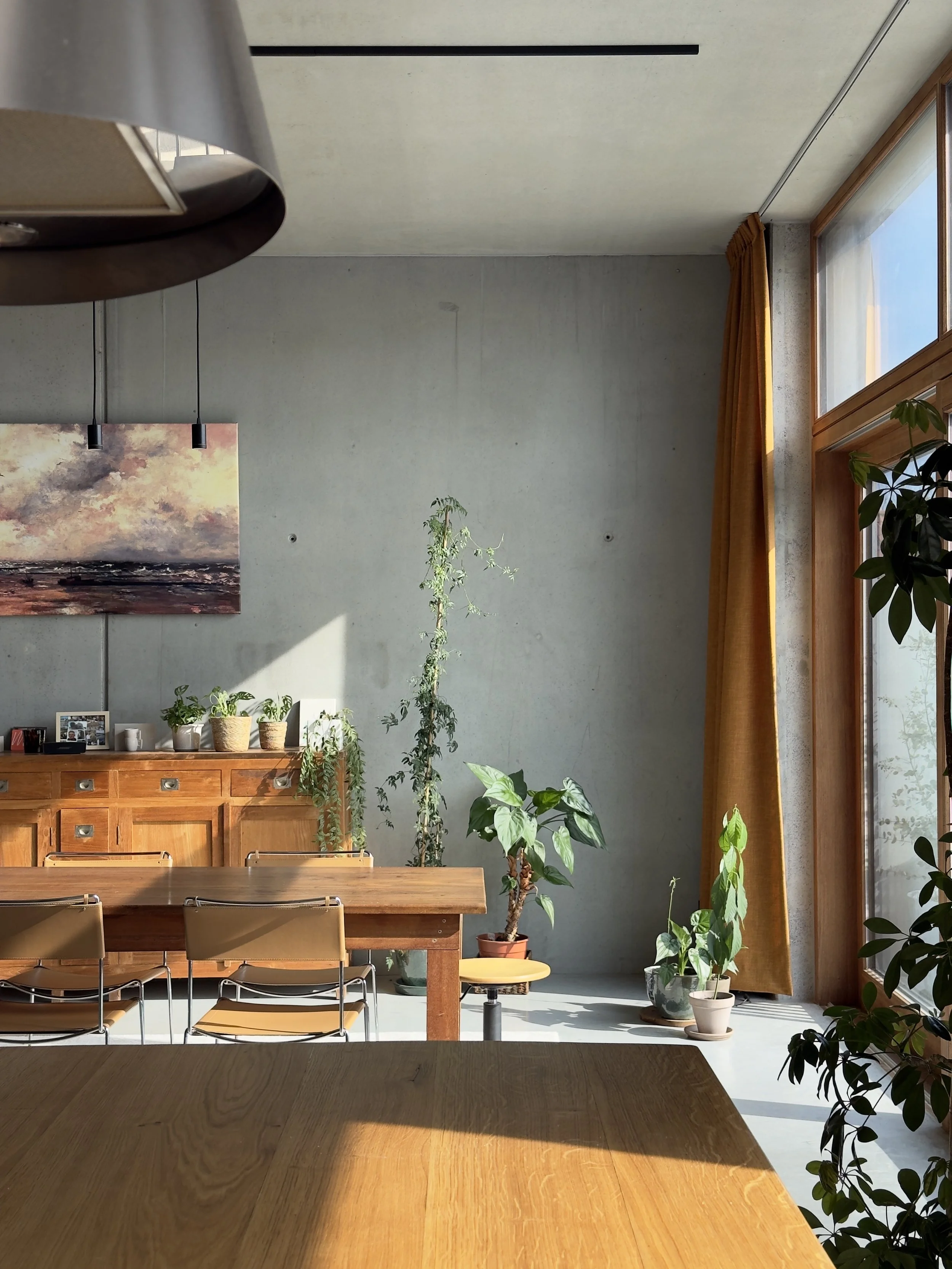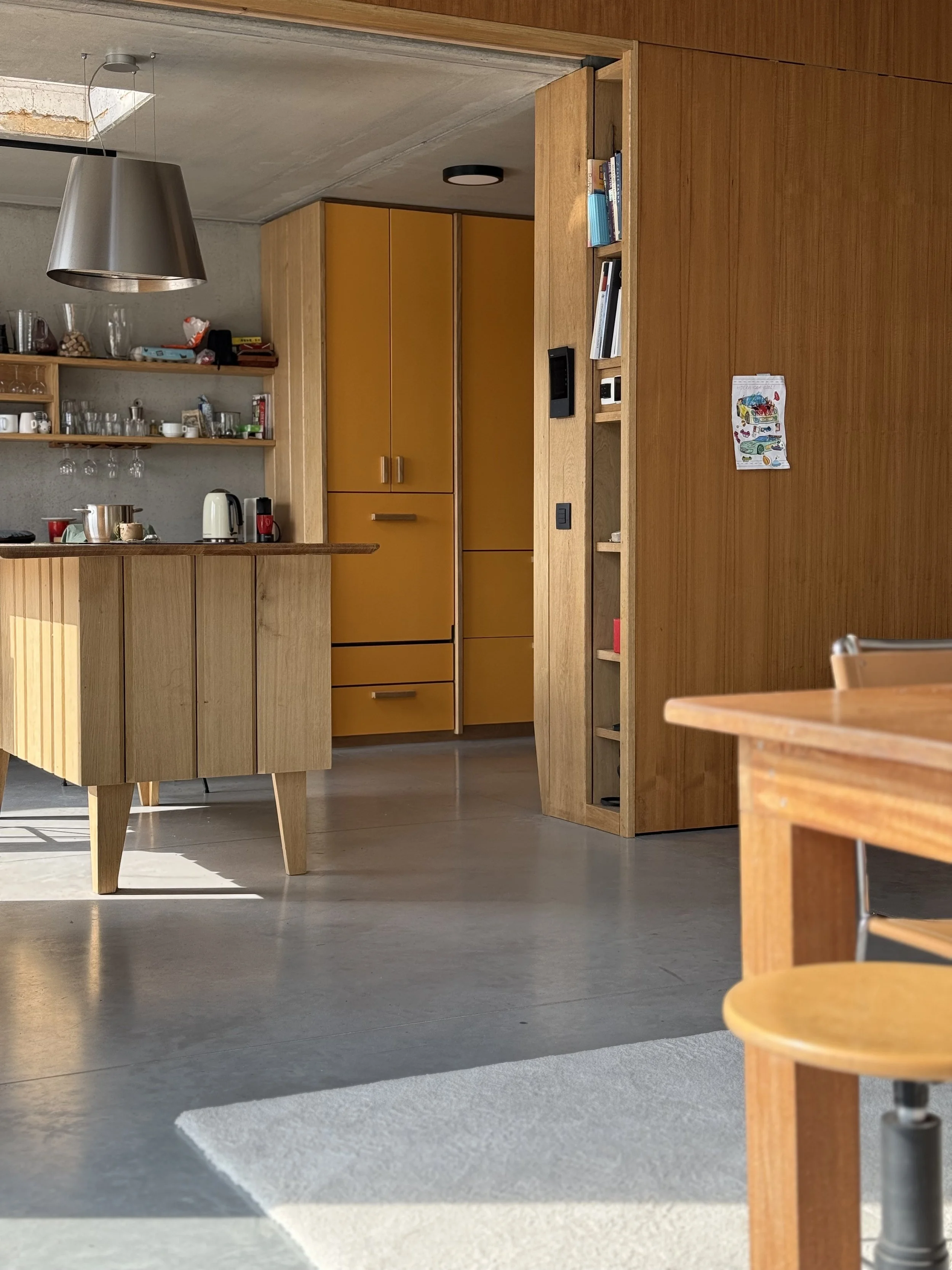 In het interieur van deze nieuwbouwwoning wordt gebruik gemaakt van eenvoudige natuurlijke materialen. Het contrast tussen enerzijds het ruwe industriële karakter van het beton en anderzijds de natuurlijke zachtheid van het hout, zorgen voor een harmonieus samenspel, een warme sfeer met een maritiem karakter.