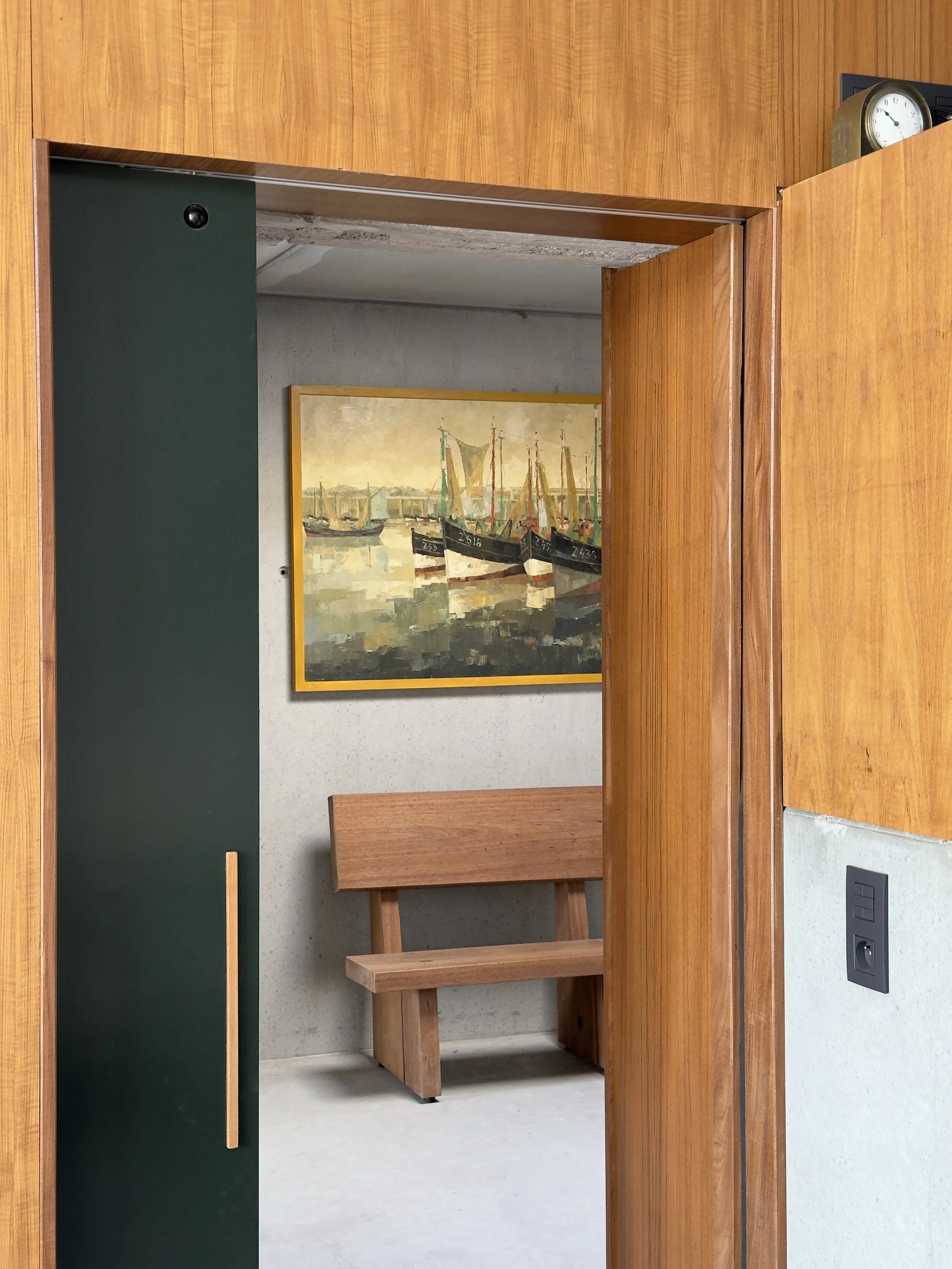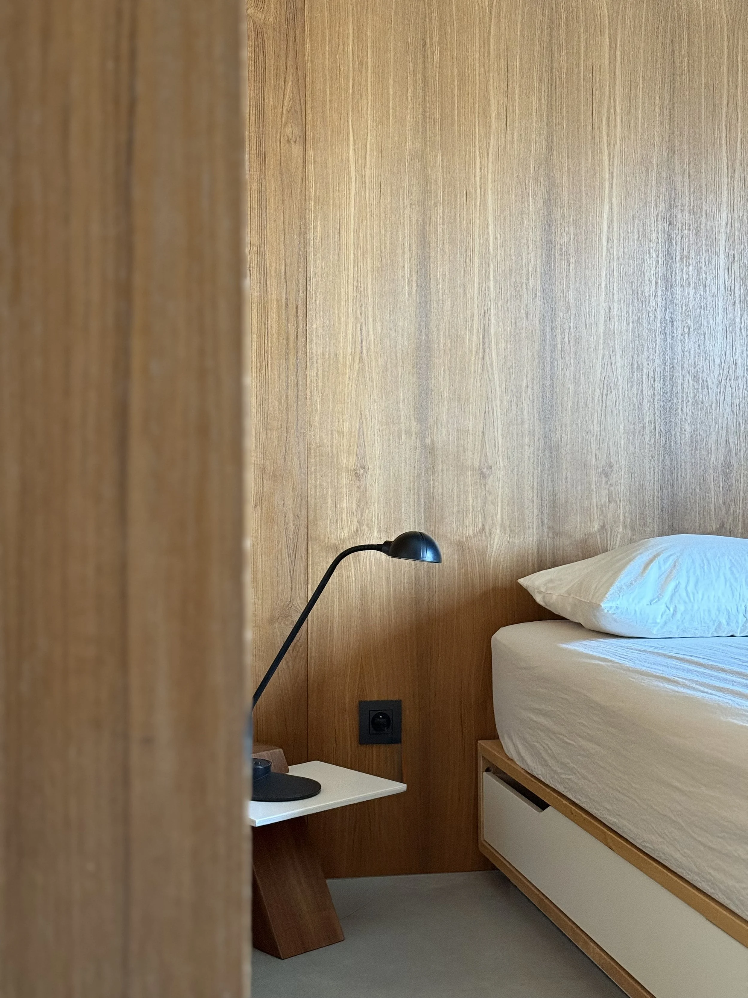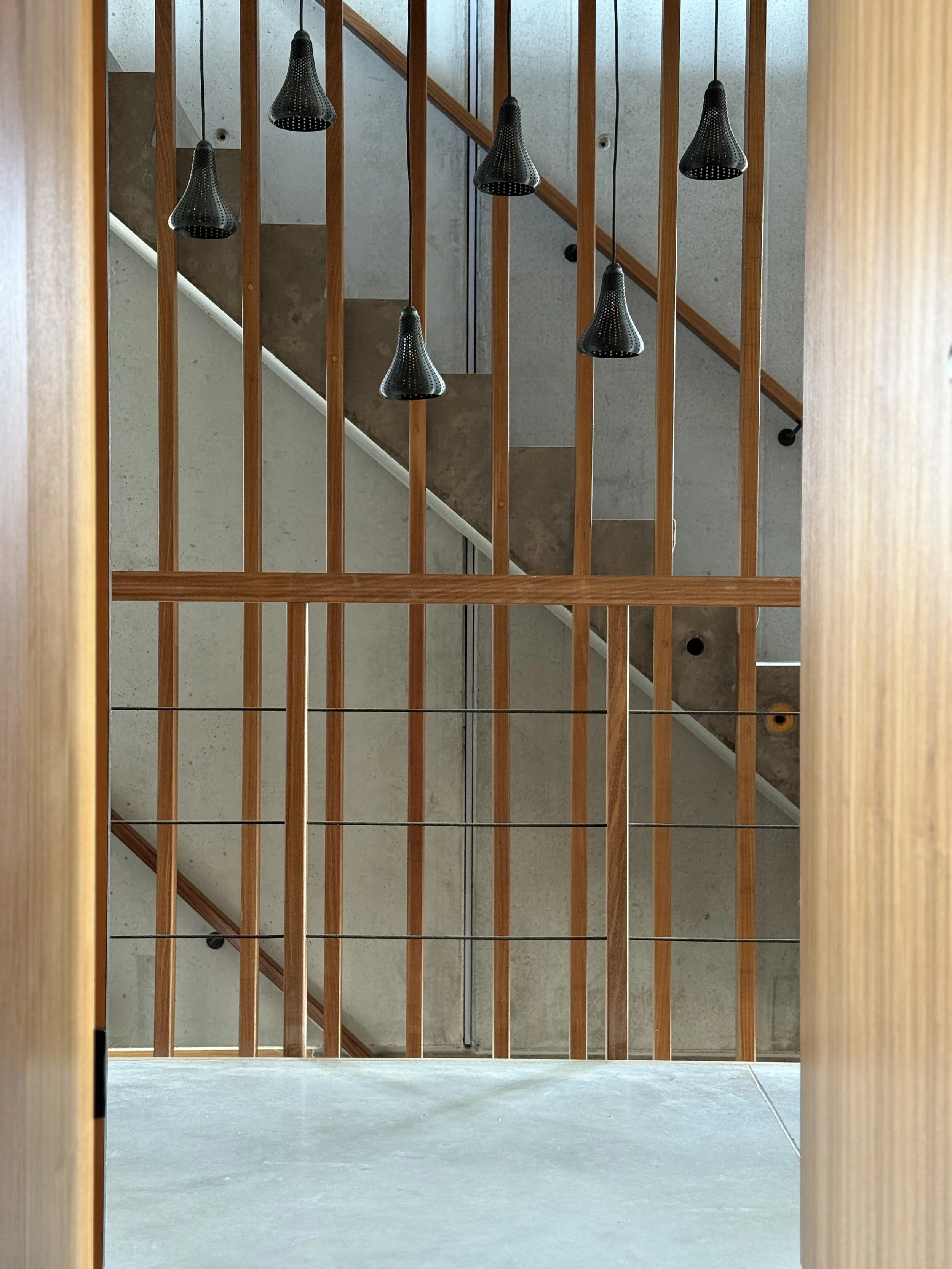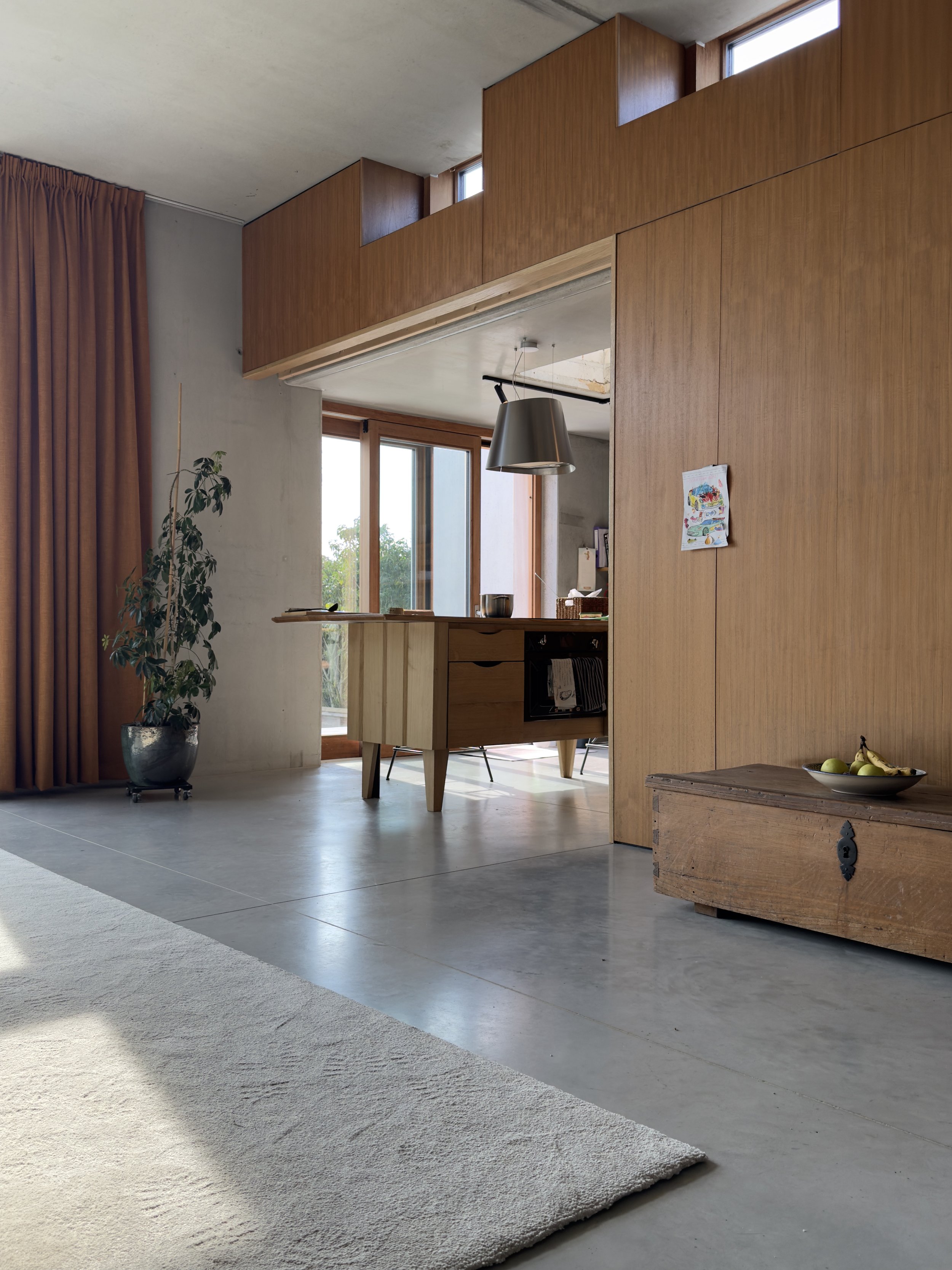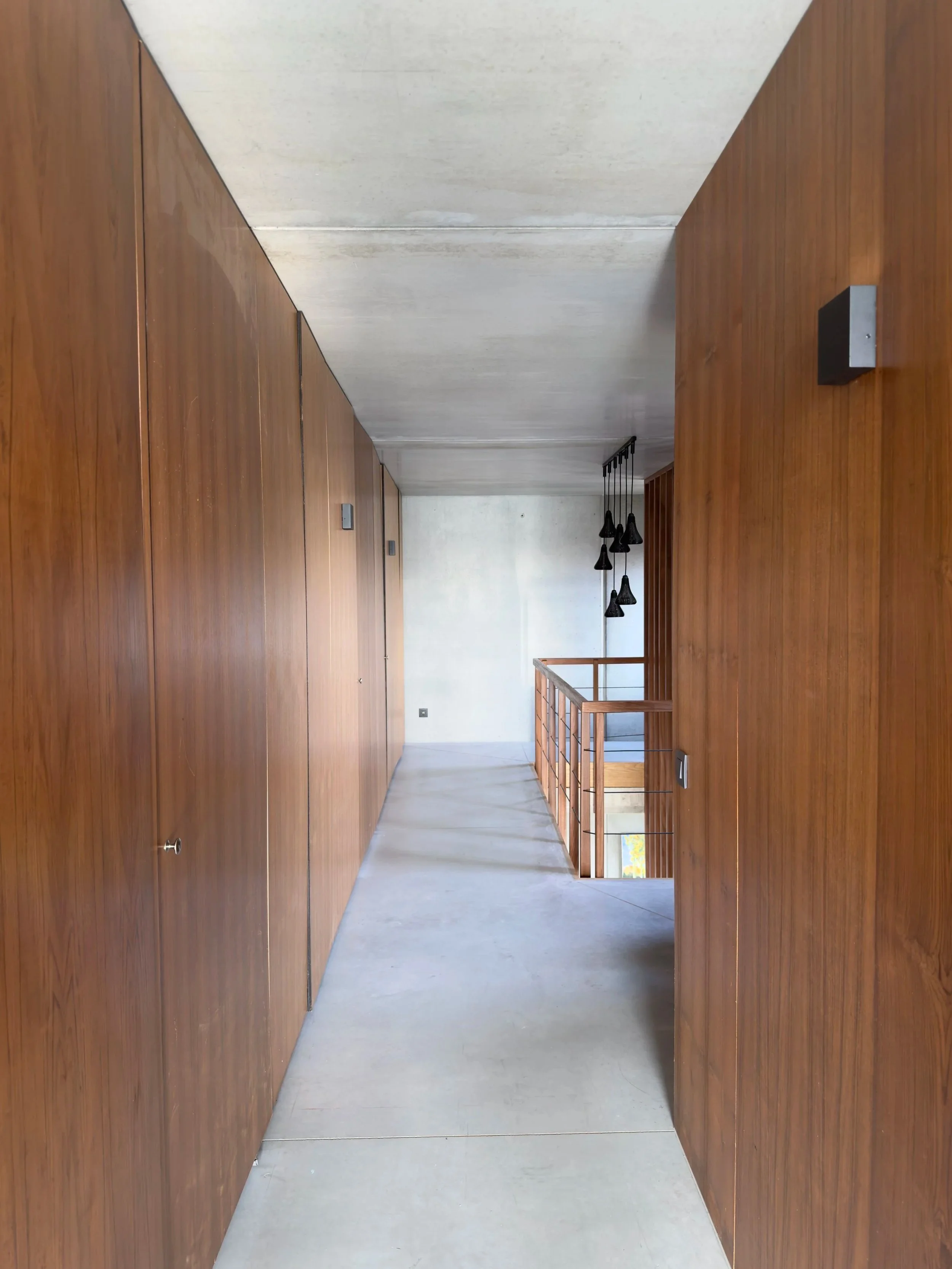 In het interieur van deze nieuwbouwwoning wordt gebruik gemaakt van eenvoudige natuurlijke materialen. Het contrast tussen enerzijds het ruwe industriële karakter van het beton en anderzijds de natuurlijke zachtheid van het hout, zorgen voor een harmonieus samenspel, een warme sfeer met een maritiem karakter.