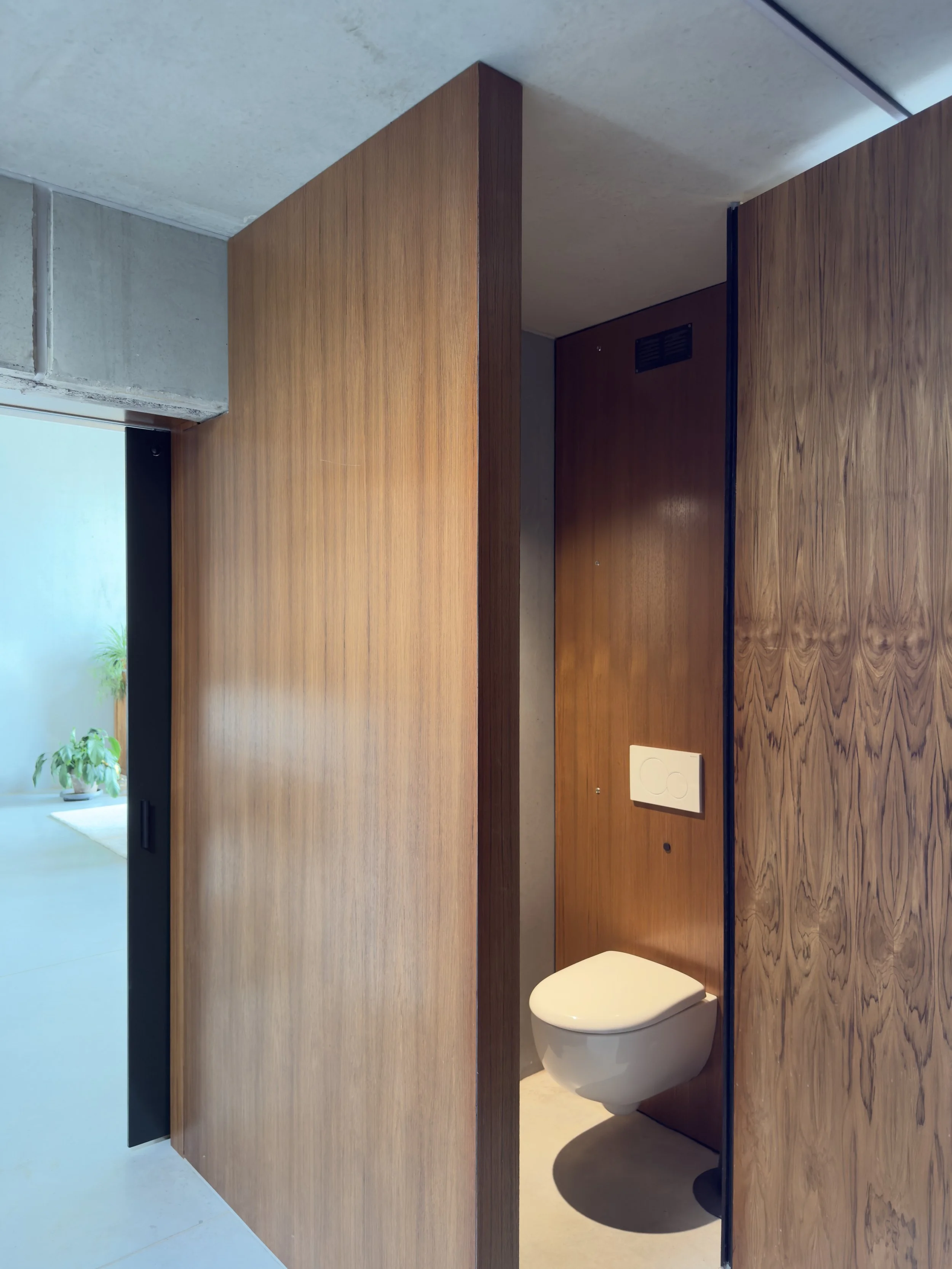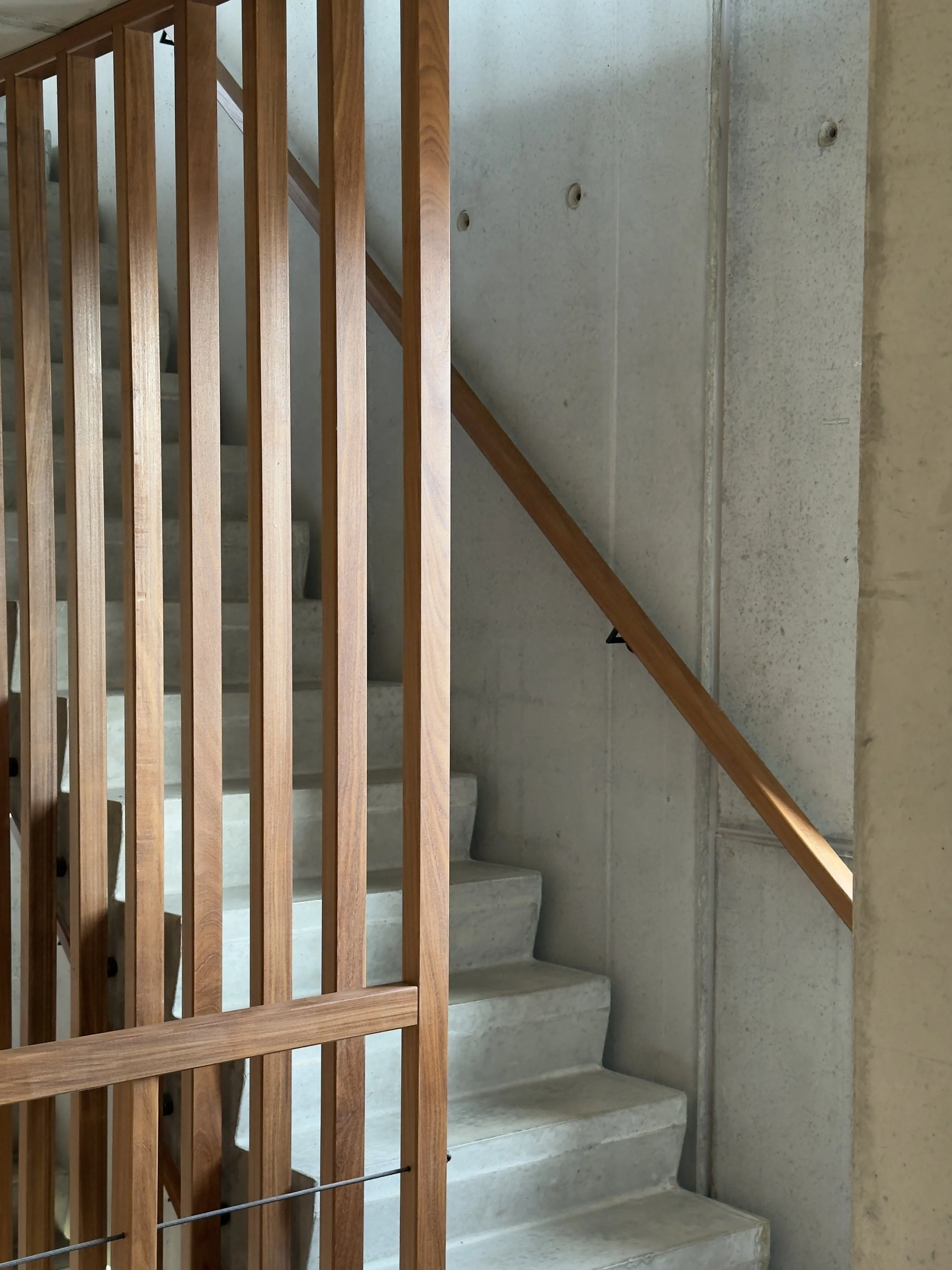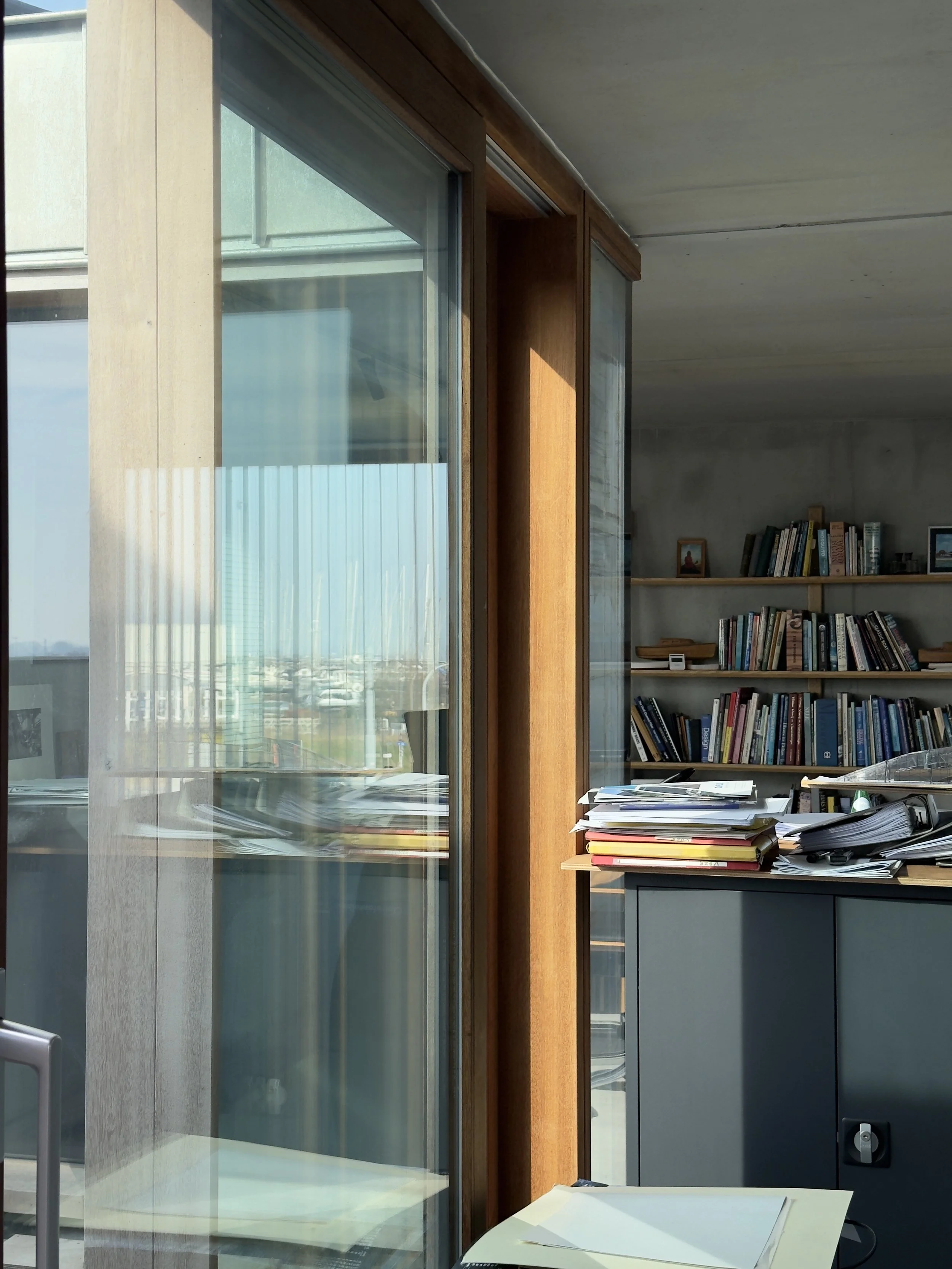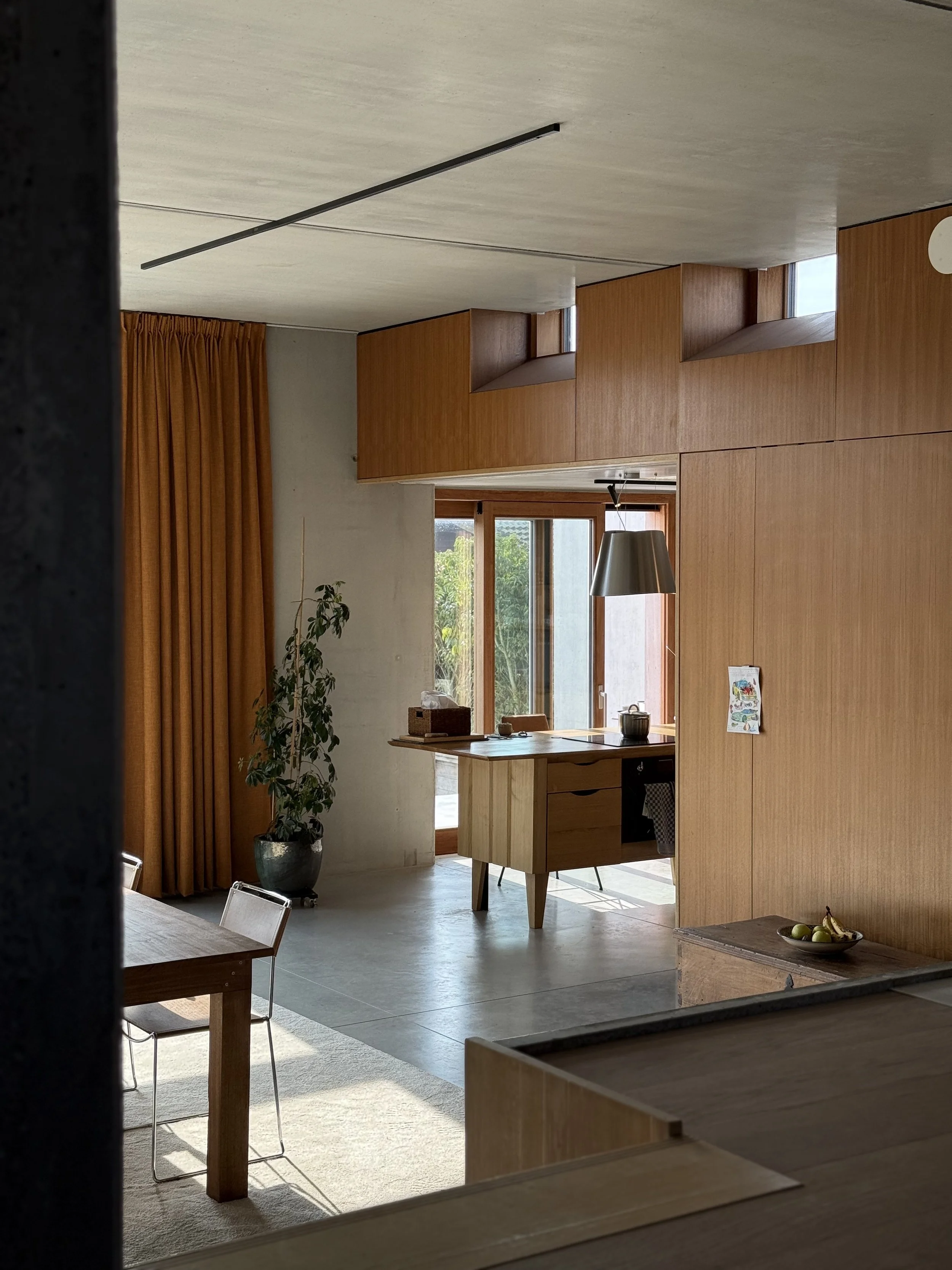 In het interieur van deze nieuwbouwwoning wordt gebruik gemaakt van eenvoudige natuurlijke materialen. Het contrast tussen enerzijds het ruwe industriële karakter van het beton en anderzijds de natuurlijke zachtheid van het hout, zorgen voor een harmonieus samenspel, een warme sfeer met een maritiem karakter.