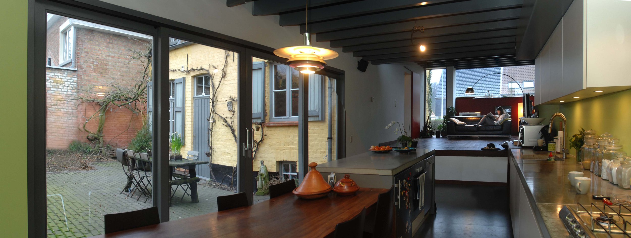 Renovatie van het bestaande woonhuis met respect voor het authentieke karakter. Een eigentijdse uitbreiding met keuken en living. Met geslotenheid naar de straat toe en veel licht en zicht op de binnenkoer en de tuin.