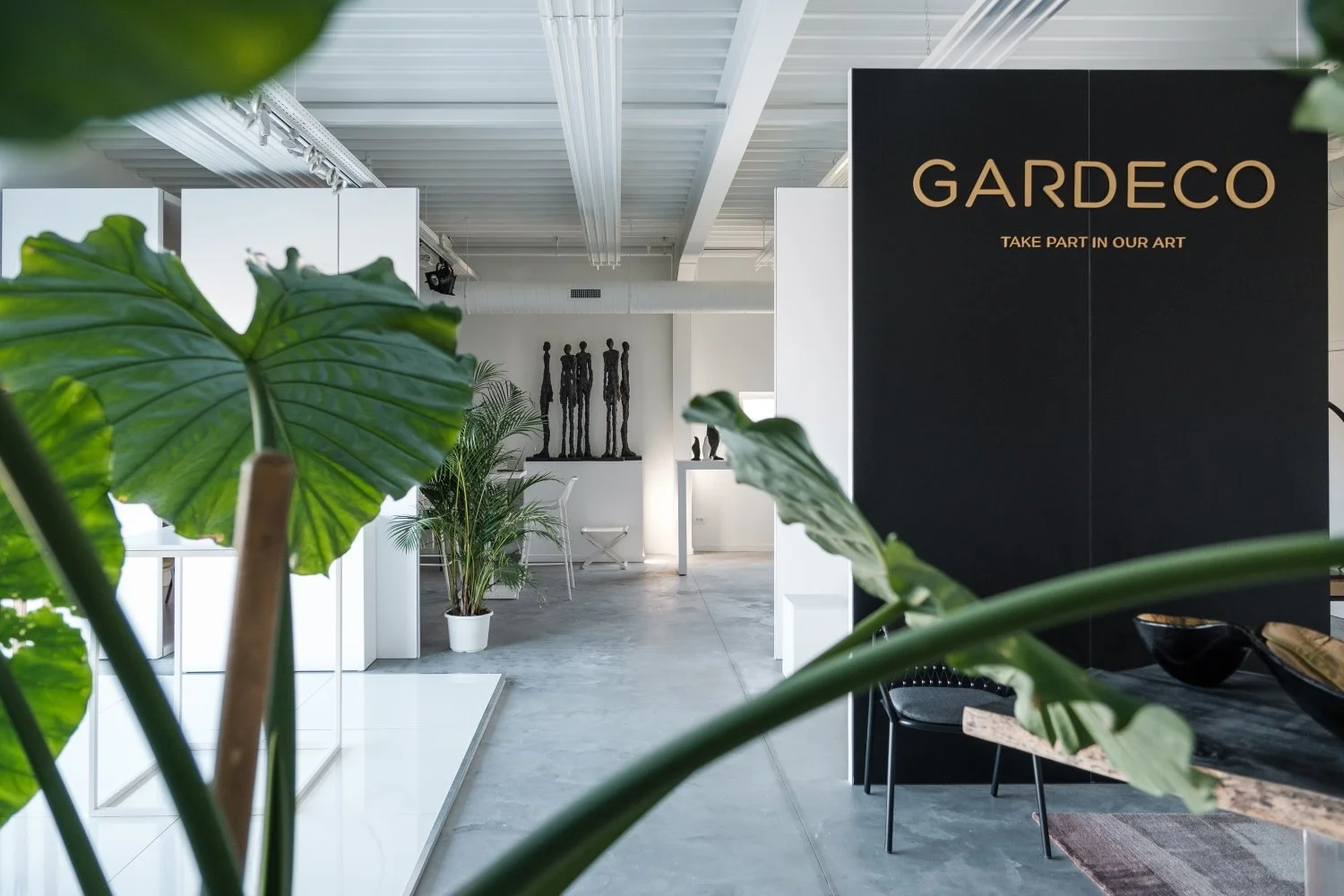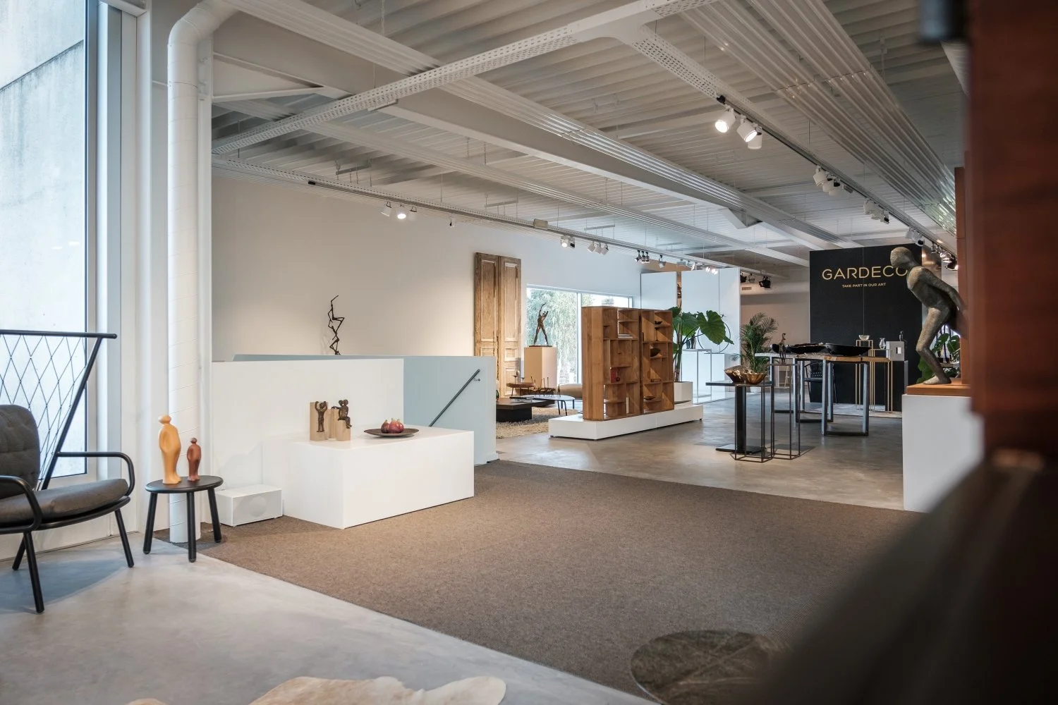 Gardeco Zedelgem. Uitbreiding showroom en warehouse voor bedrijf gespecialiseerd in internationale kunst en design. Opgetrokken in prefab betonnen sandwichpanelen, staalstructuur en grote glaspartijen.