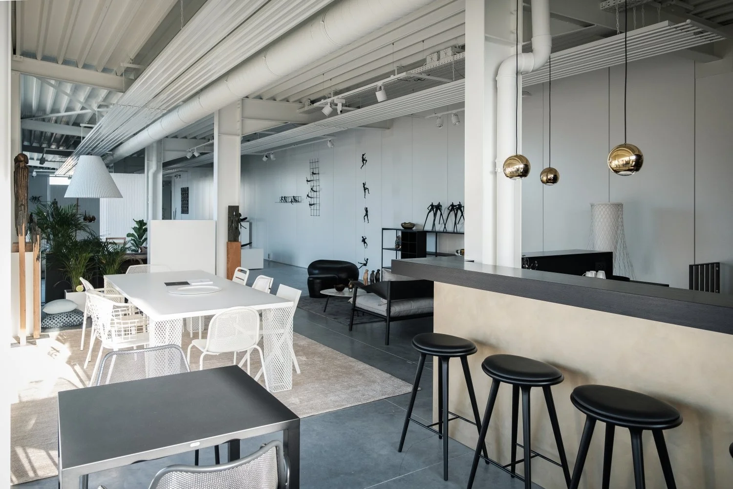 Gardeco Zedelgem. Uitbreiding showroom en warehouse voor bedrijf gespecialiseerd in internationale kunst en design. Opgetrokken in prefab betonnen sandwichpanelen, staalstructuur en grote glaspartijen.