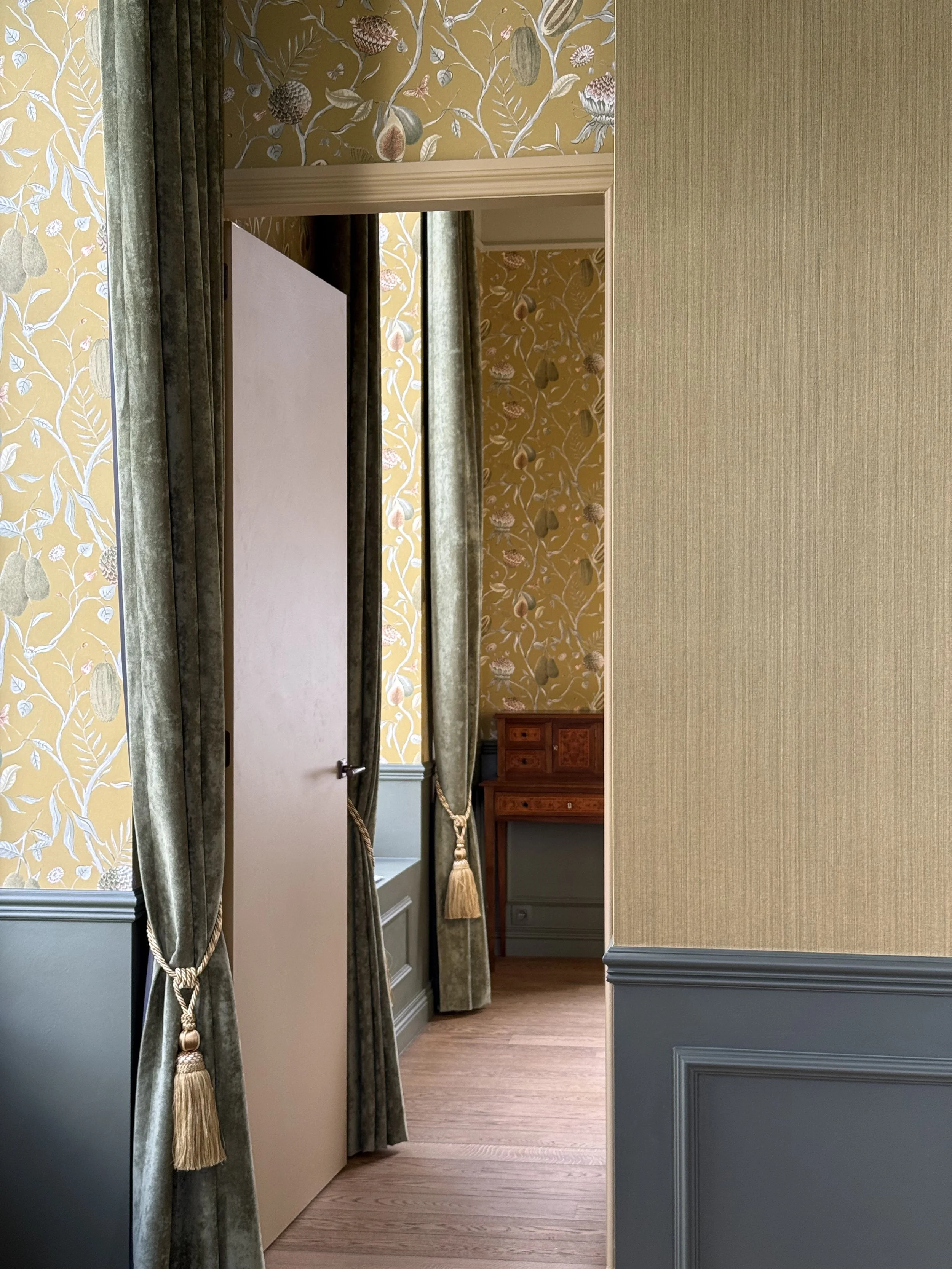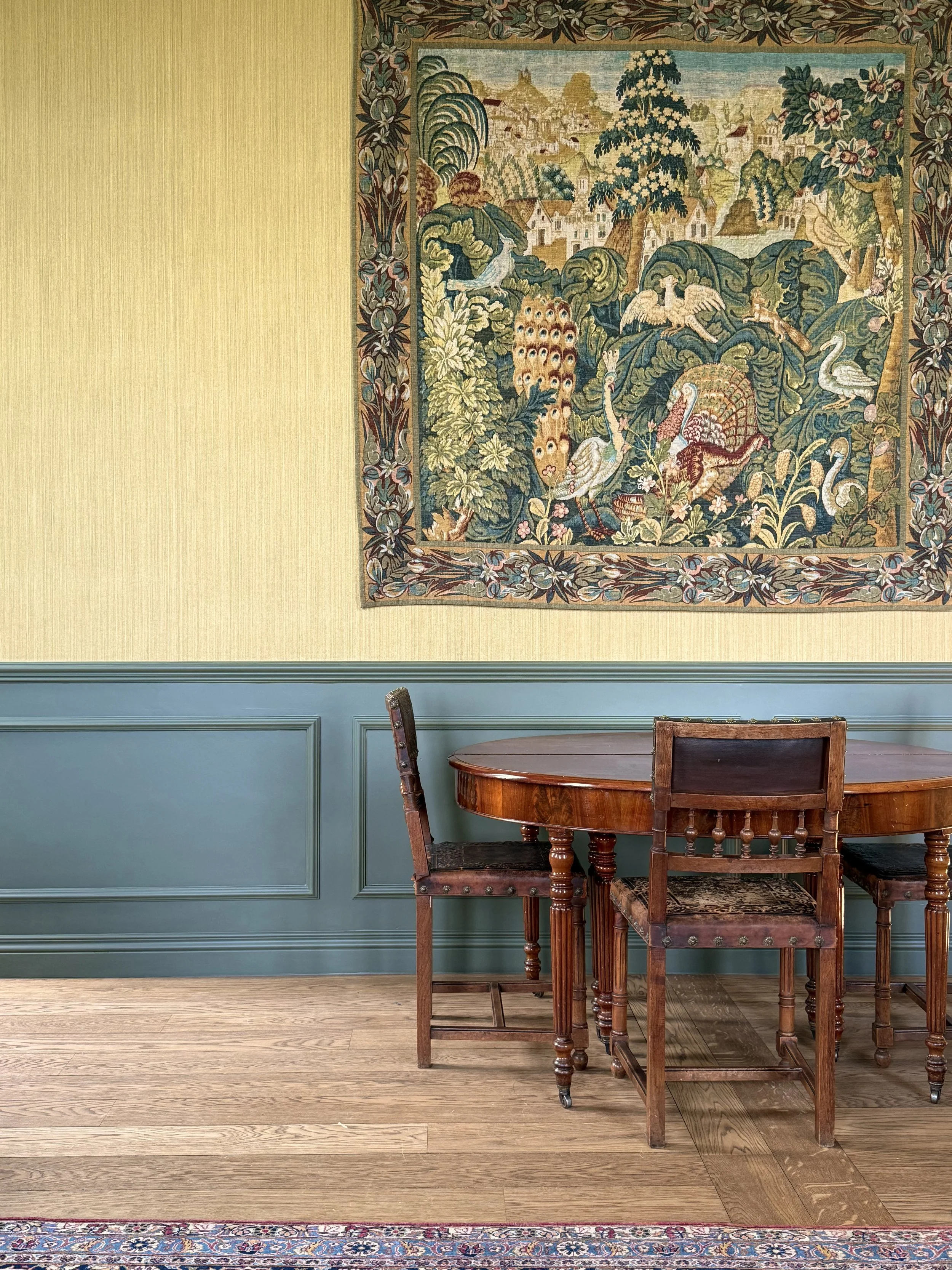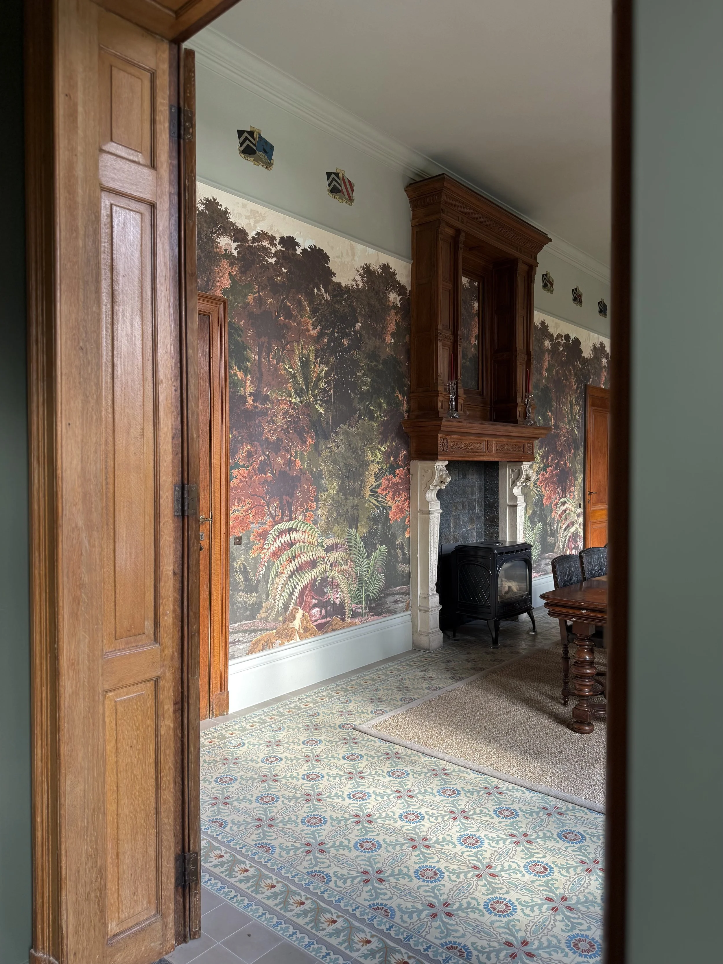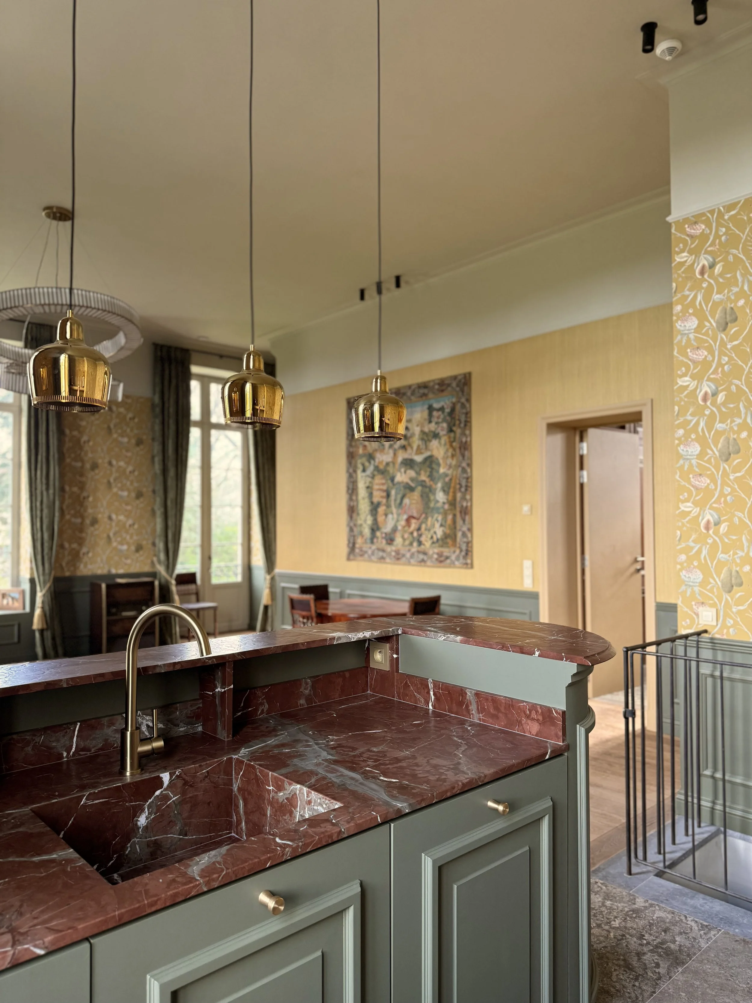 In dit geschiedkundige pand uit de 16e eeuw werd de riante inkomhal, die ook dienst doet als eetplaats, in stijl aangekleed, met respect voor de authentieke elementen. Het achterliggend salon/ontvangstruimte werd ingericht in dezelfde klassieke stijl. De warme tinten van het behang zorgen voor een zonnige sfeer.