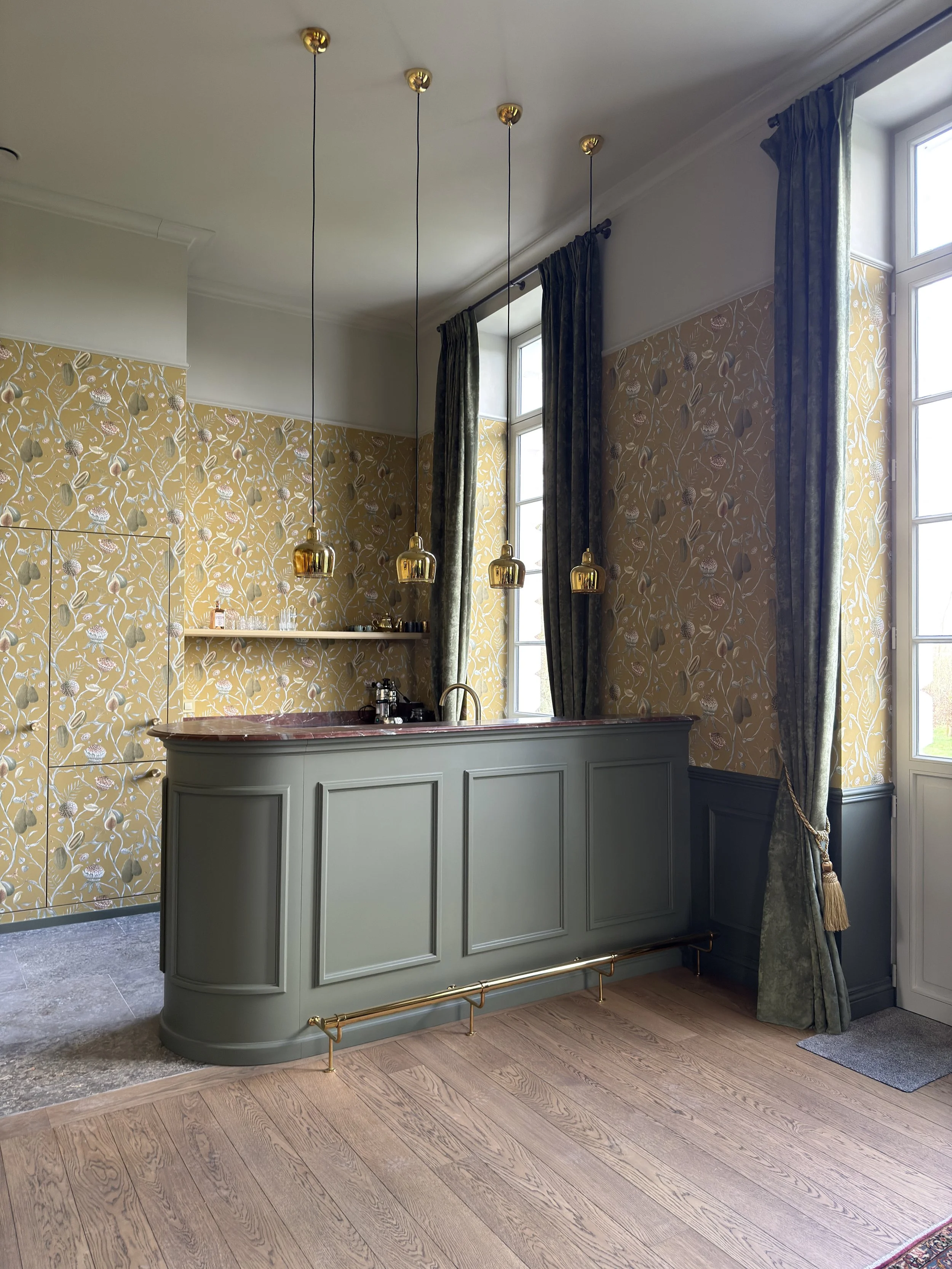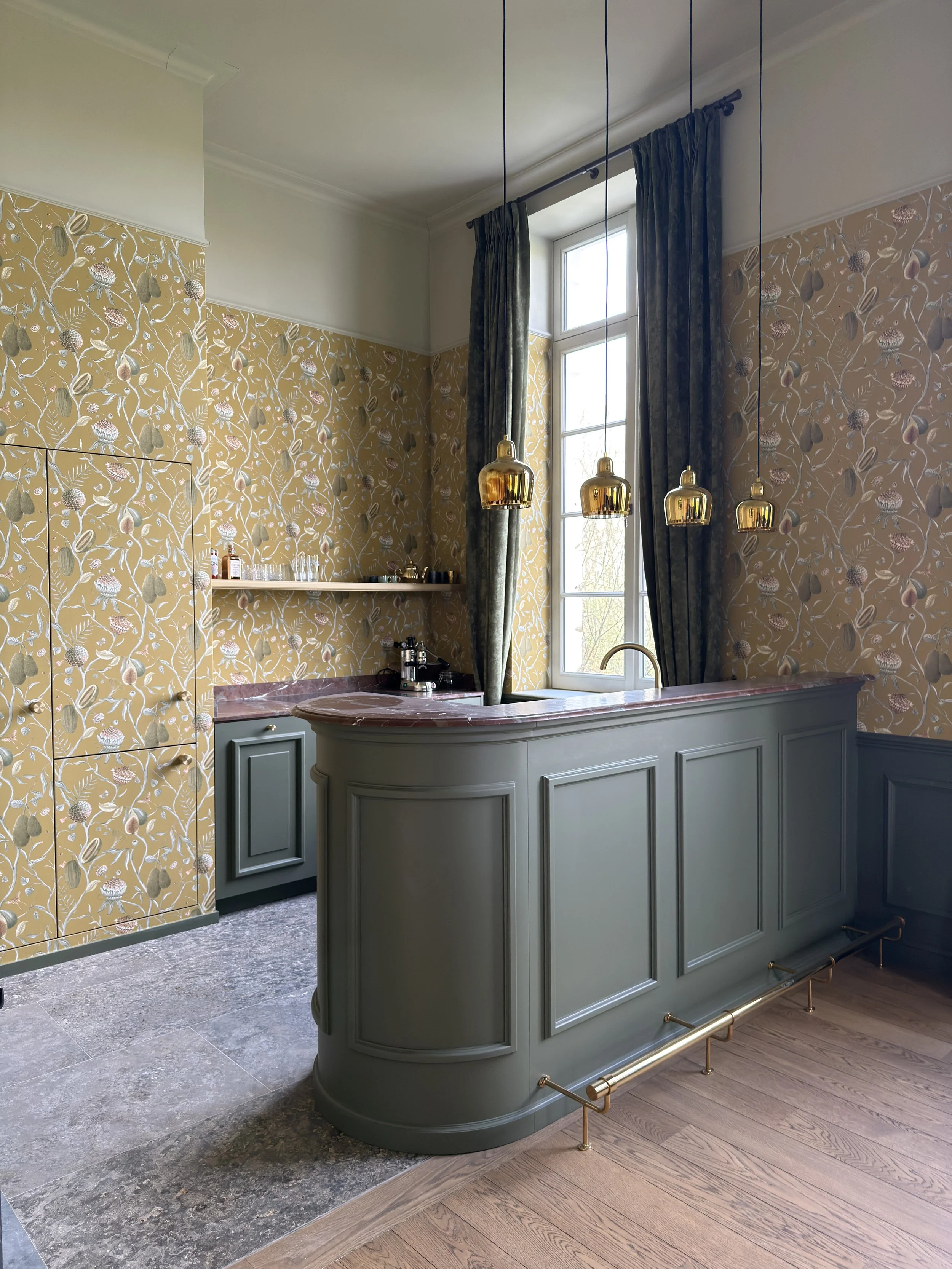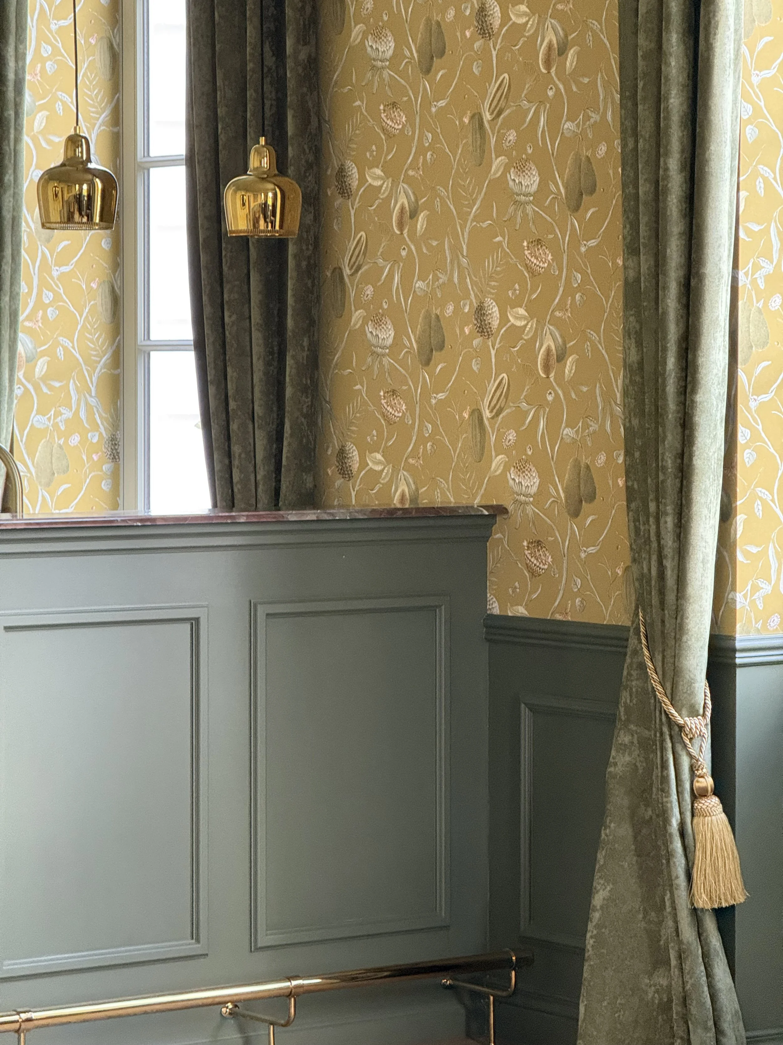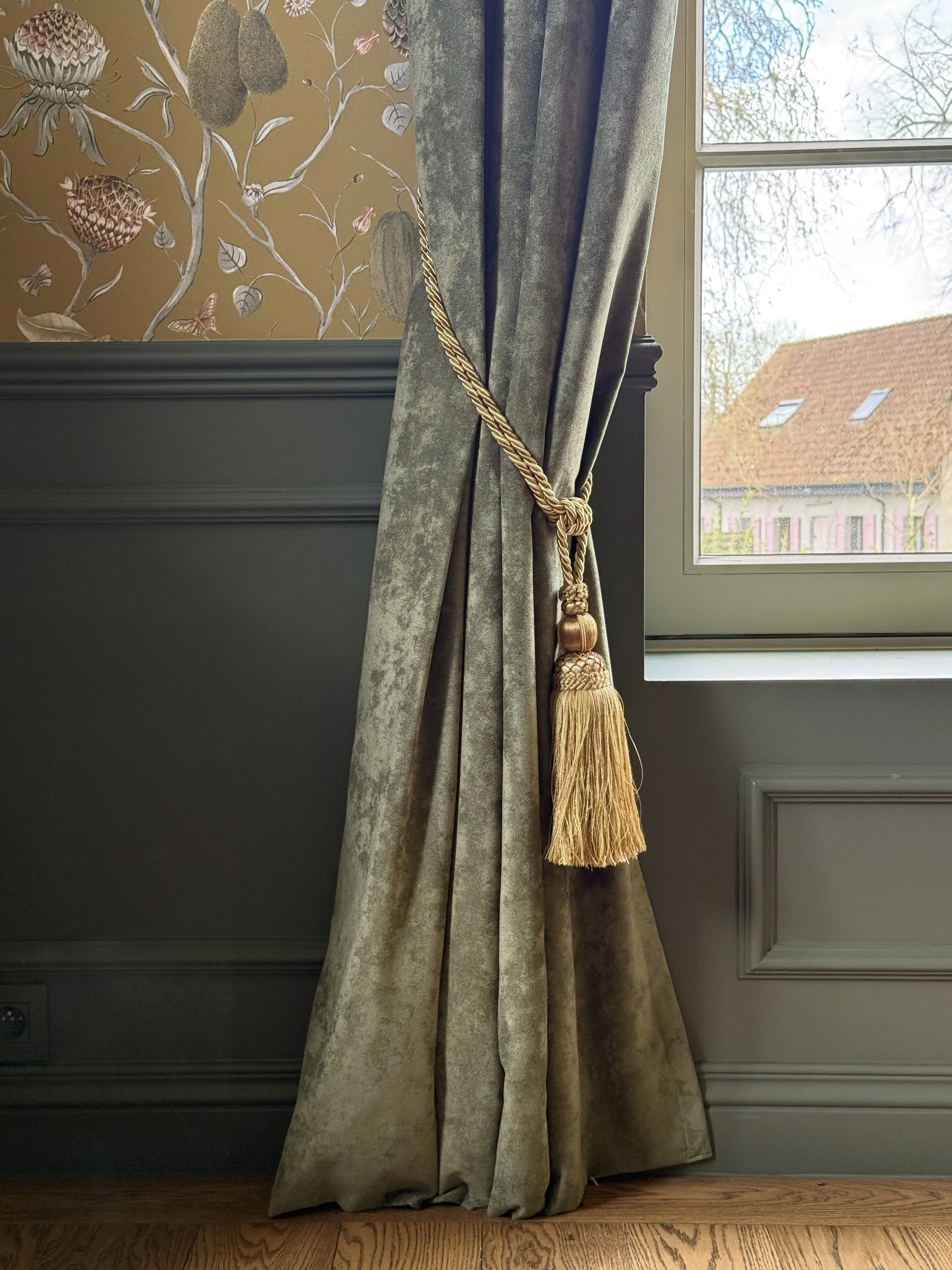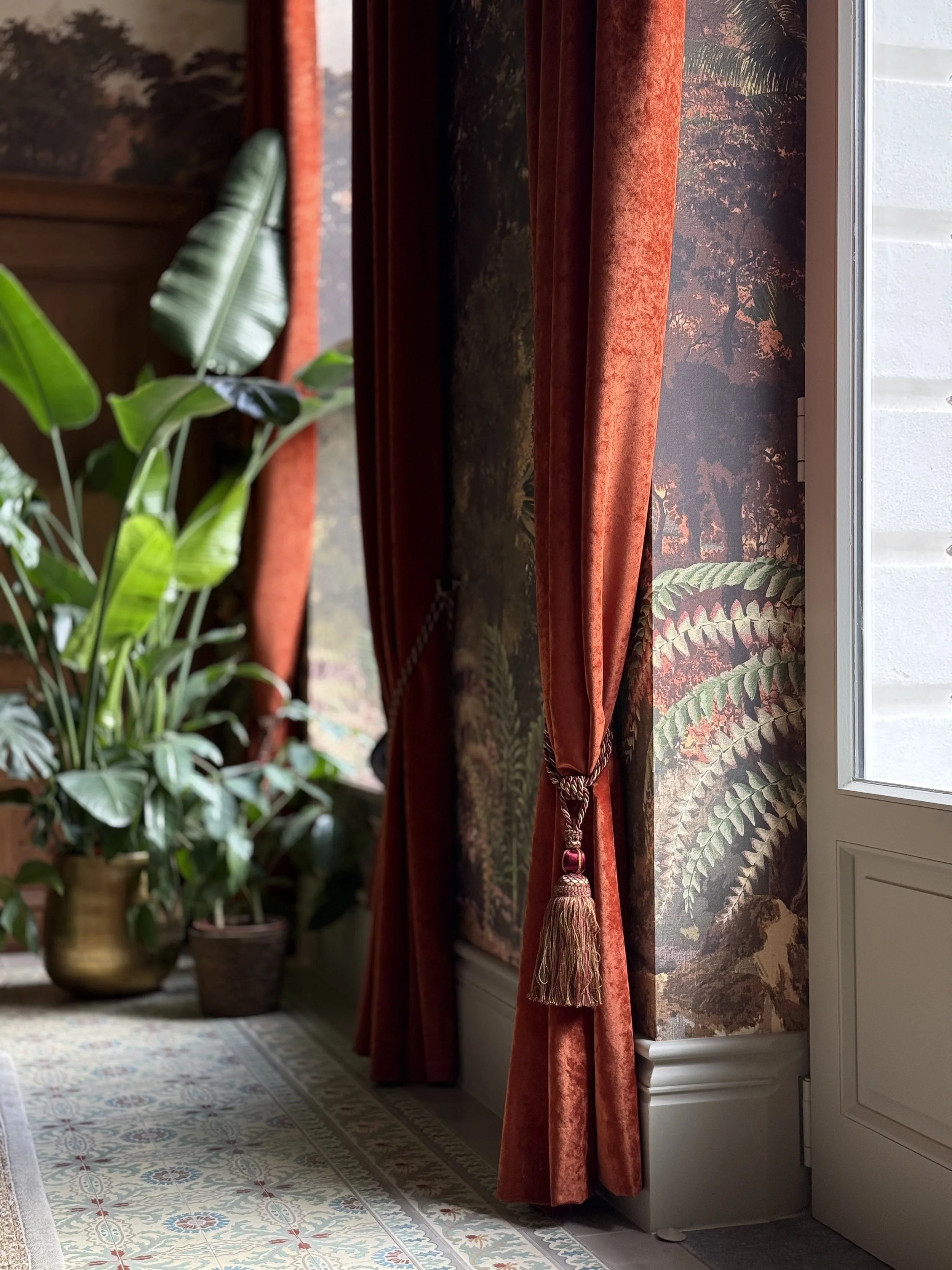 In dit geschiedkundige pand uit de 16e eeuw werd de riante inkomhal, die ook dienst doet als eetplaats, in stijl aangekleed, met respect voor de authentieke elementen. Het achterliggend salon/ontvangstruimte werd ingericht in dezelfde klassieke stijl. De warme tinten van het behang zorgen voor een zonnige sfeer.