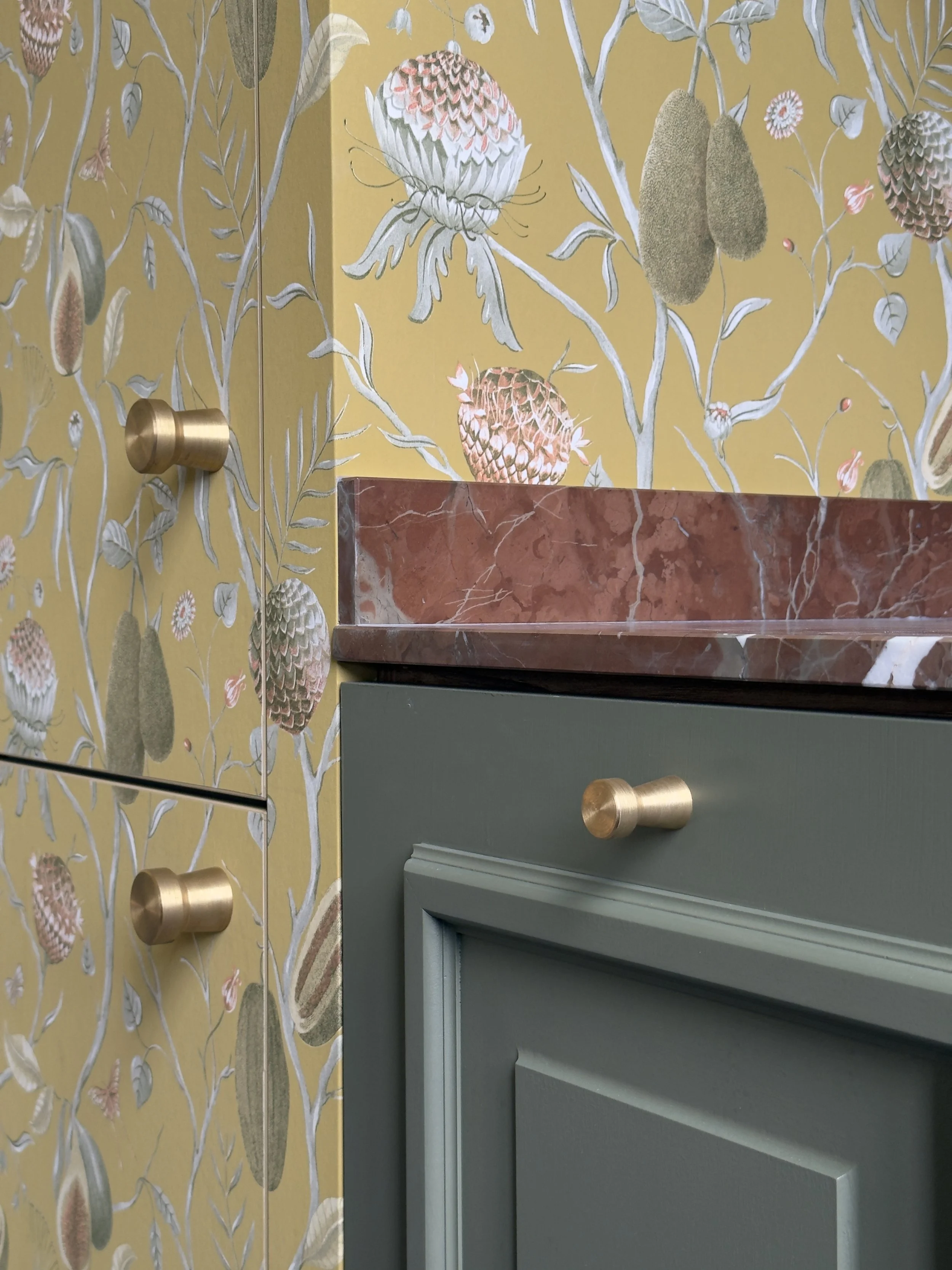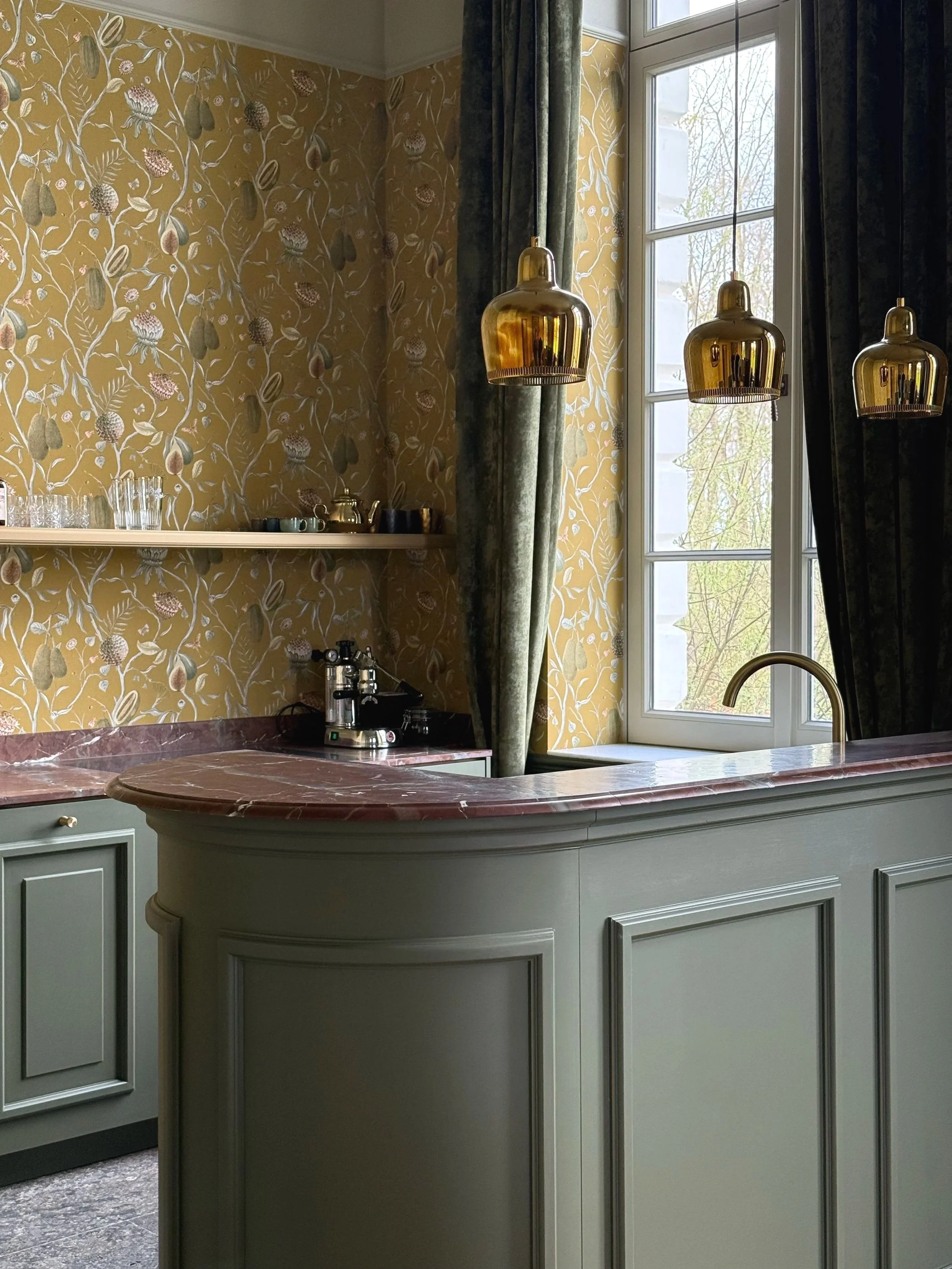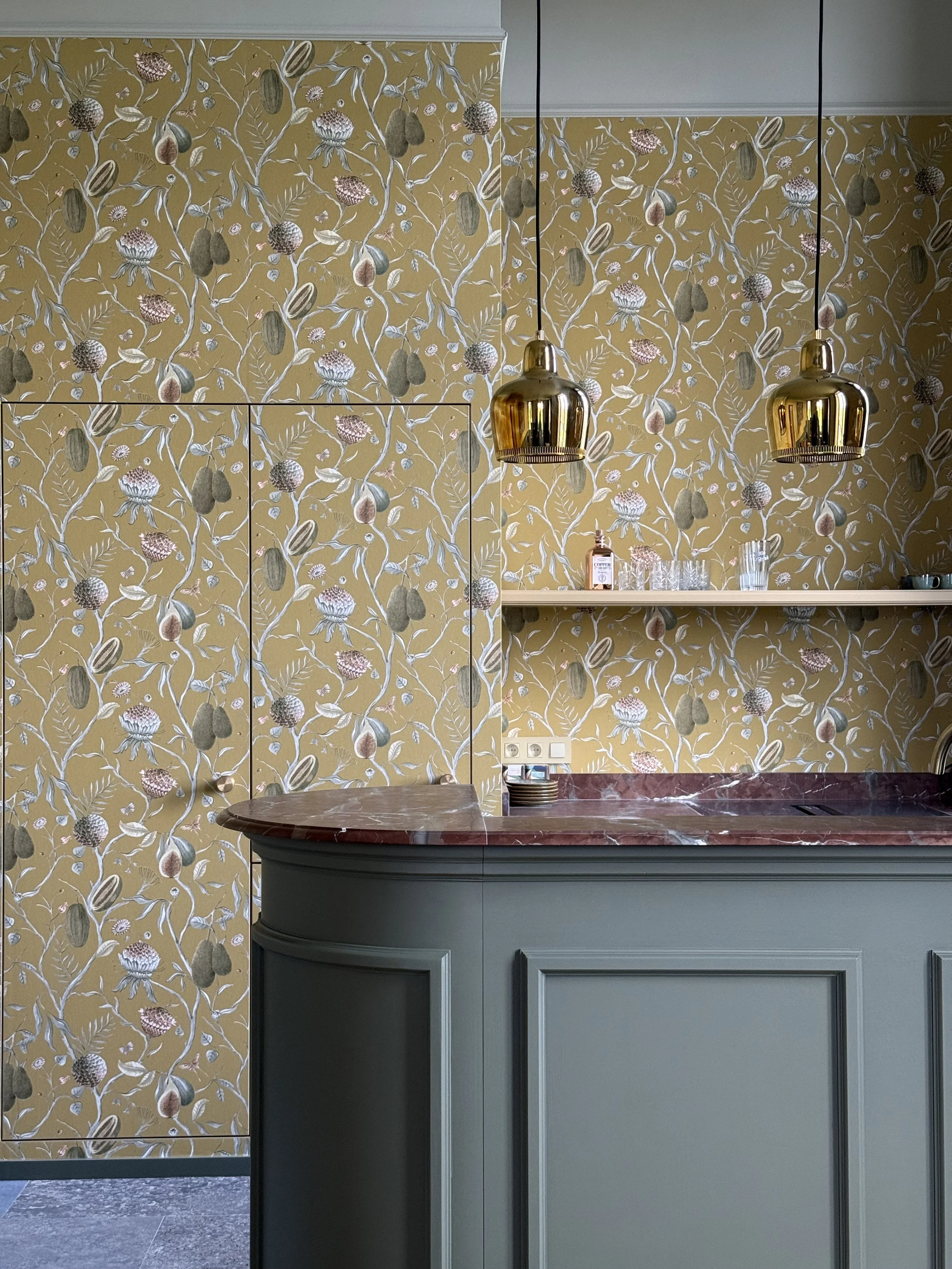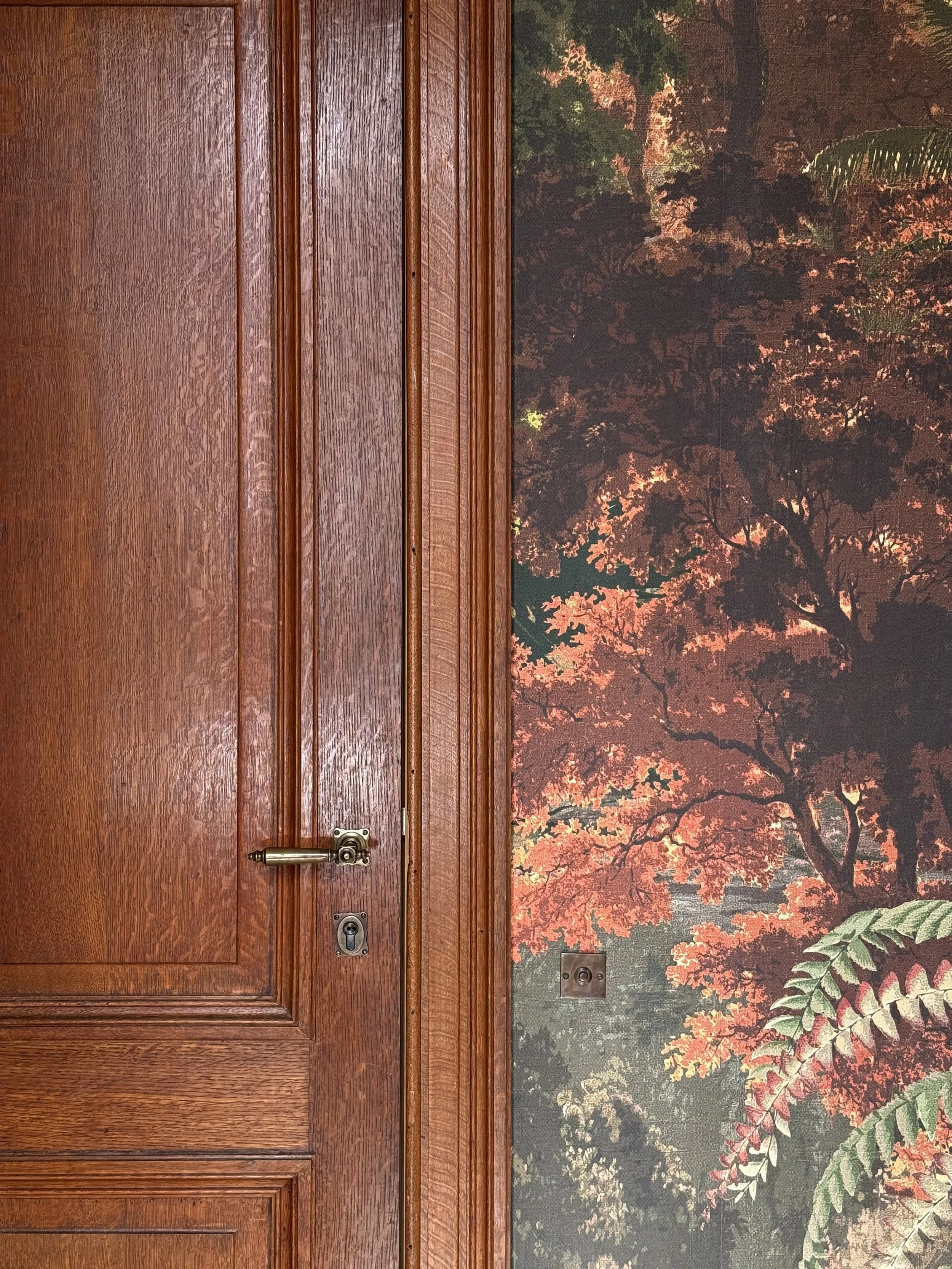In dit geschiedkundige pand uit de 16e eeuw werd de riante inkomhal, die ook dienst doet als eetplaats, in stijl aangekleed, met respect voor de authentieke elementen. Het achterliggend salon/ontvangstruimte werd ingericht in dezelfde klassieke stijl. De warme tinten van het behang zorgen voor een zonnige sfeer.